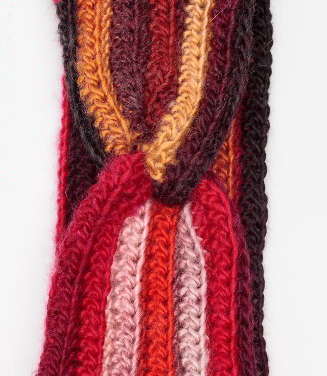 I have crocheted this twisted earwarmer headband in red/burgendy/gold variegated yarn.
