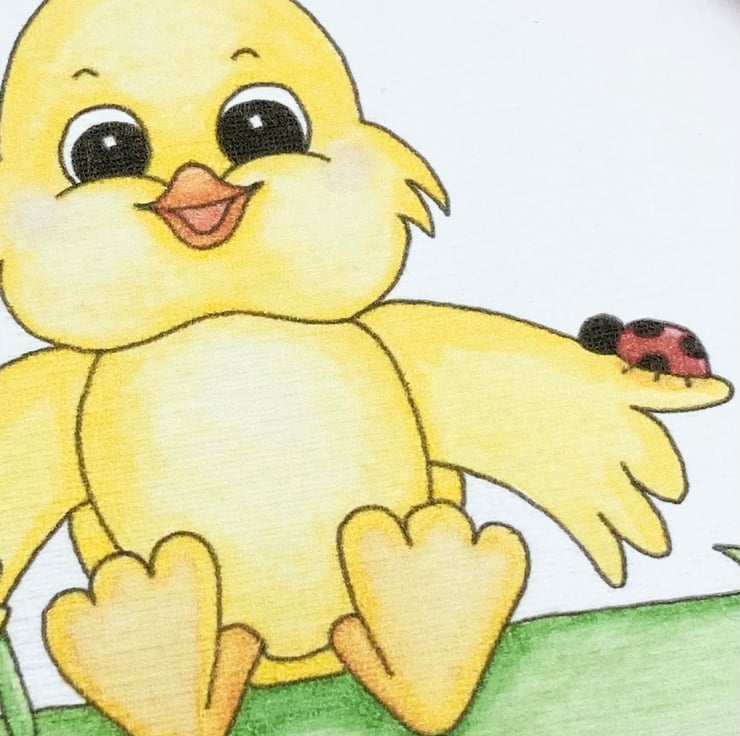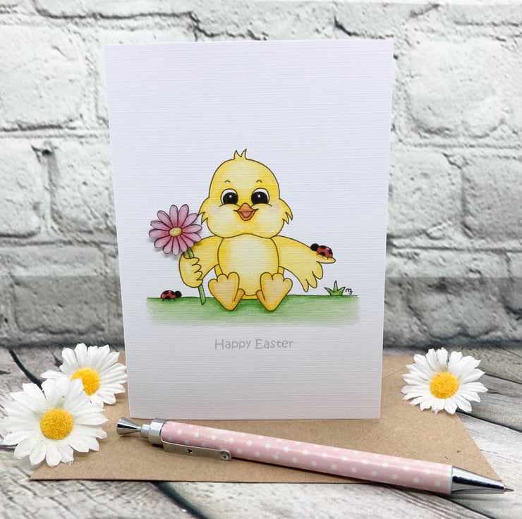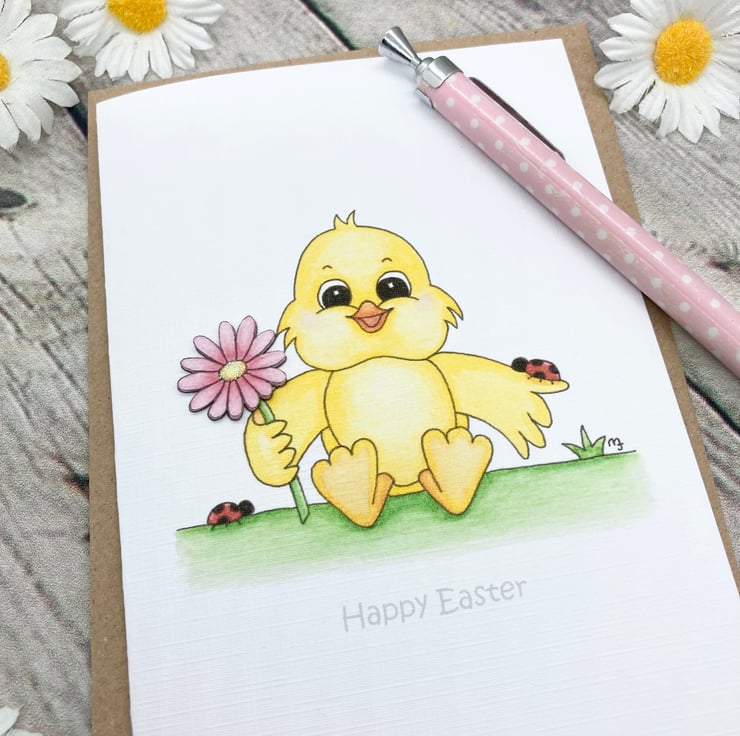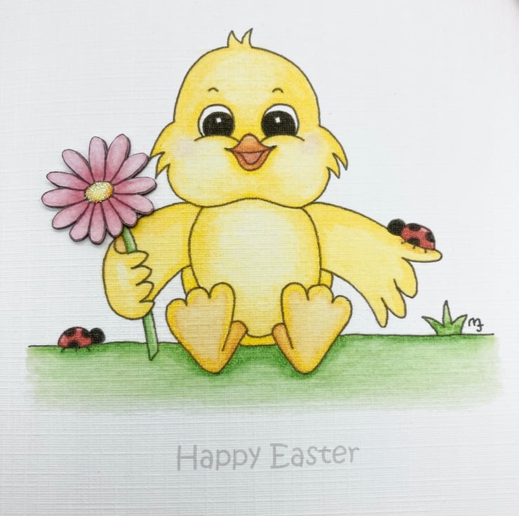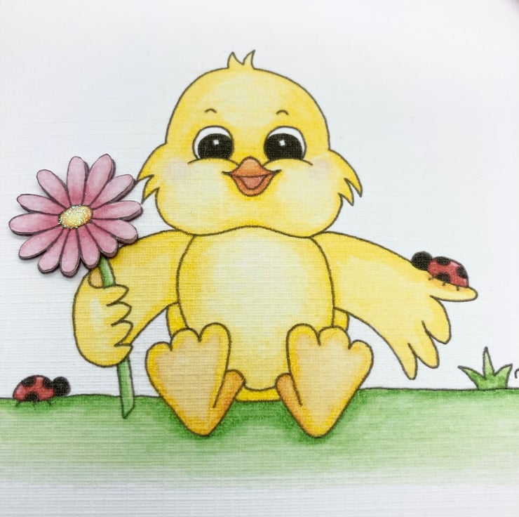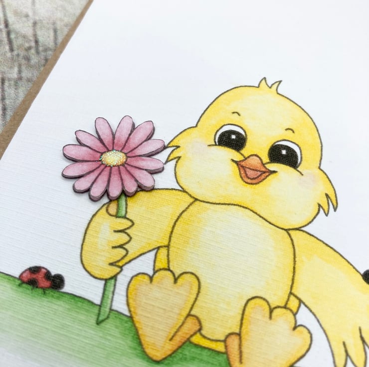 This cute Easter Chick card has been designed using my own original illustration. The image has been printed out onto good quality white linen embossed card and decoupaged up in parts. I have also added a little glitter detail.