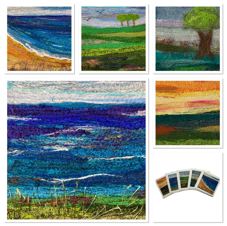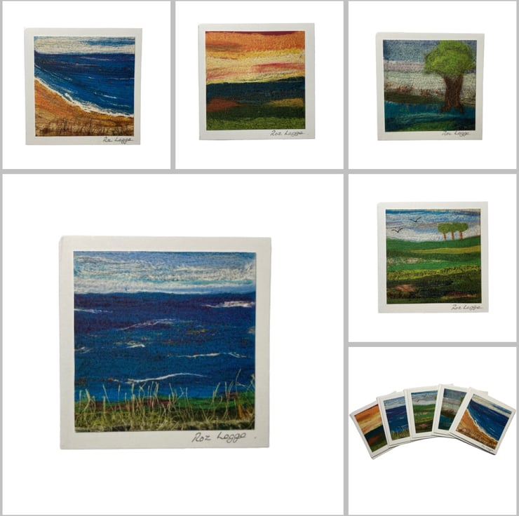 This listing is for a pack of 5 mini cards which are blank for your own message. Photographs of my textile art have been printed on good quality cartridge paper and mounted on small (3" x 3") square white cards. Each card is of a different design (one of each shown in the photographs) and is signed. The cards come with white envelopes.