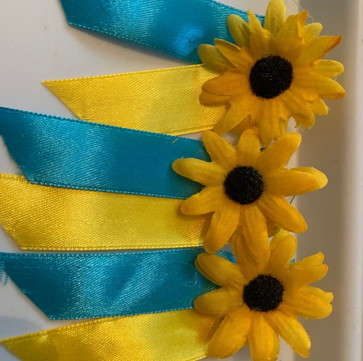 Sunflower with blue & yellow ribbon mounted on safety brooch bar with tape backing