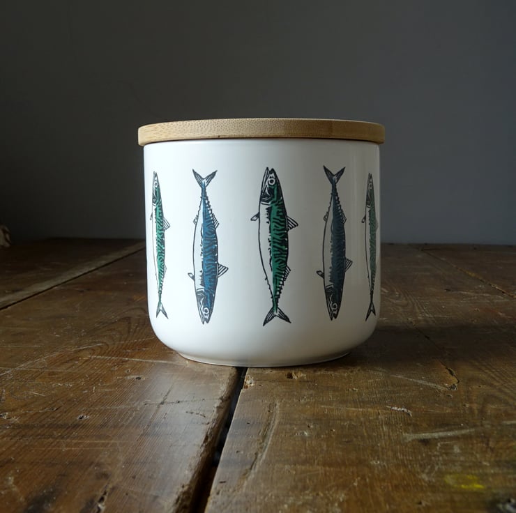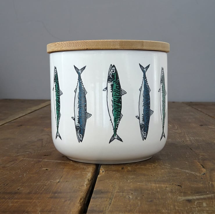 Mackerel Design Storage Jar - Bone china, wooden lid, coastal home kitchenware