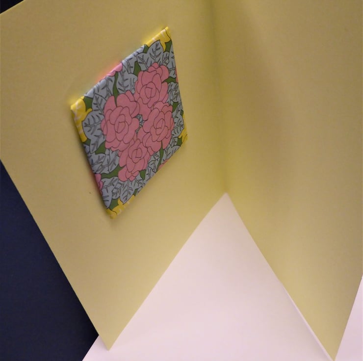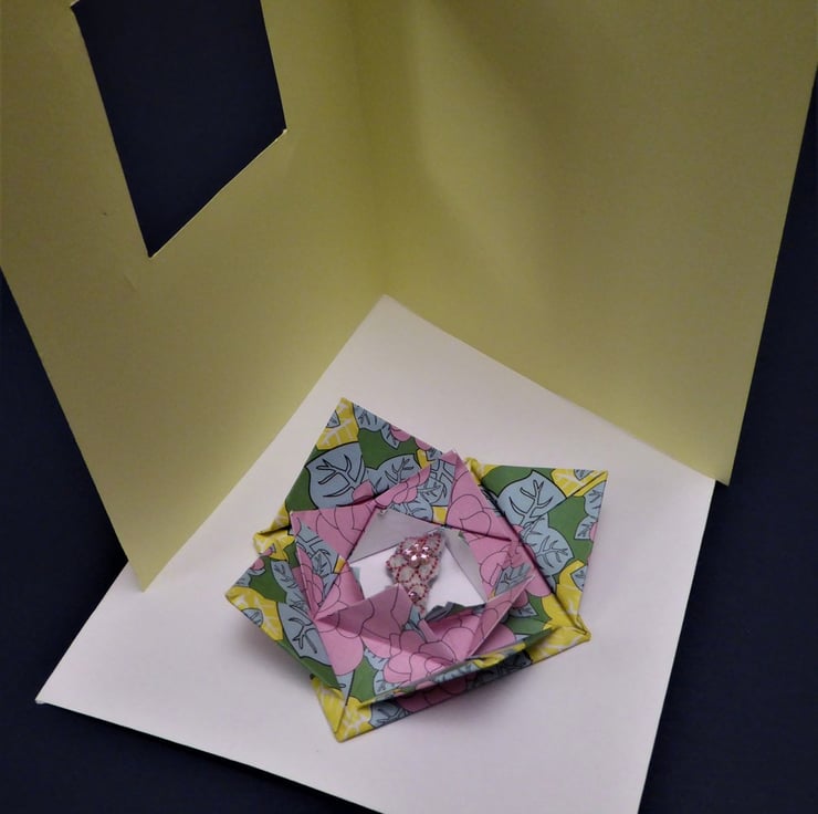 A Japanese art inspired blank card is created with a removable 'origami blossom' design.In the centre of each 'blossom' are two tiny machine embroidered felt/organza jewelled flowers. The whole ' blossom' can be removed from the card by gently easing the outside petals towards the centre. It will then slip out from its cut out card frame. They can be enjoyed as a homeware decoration.