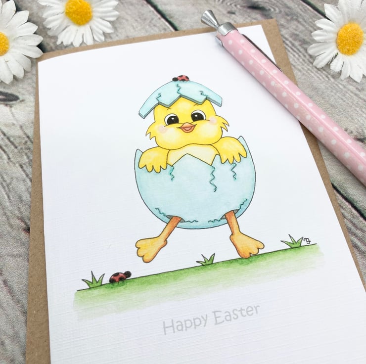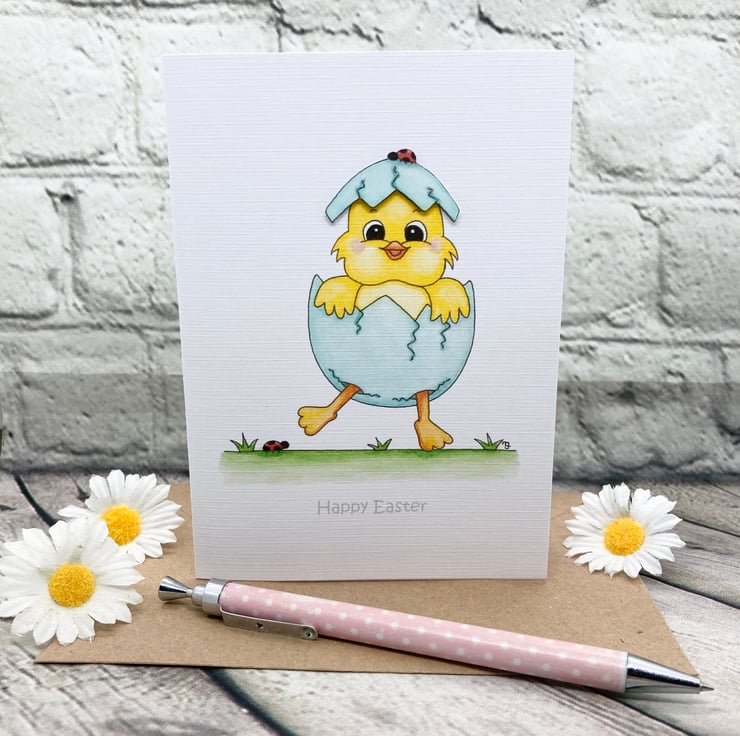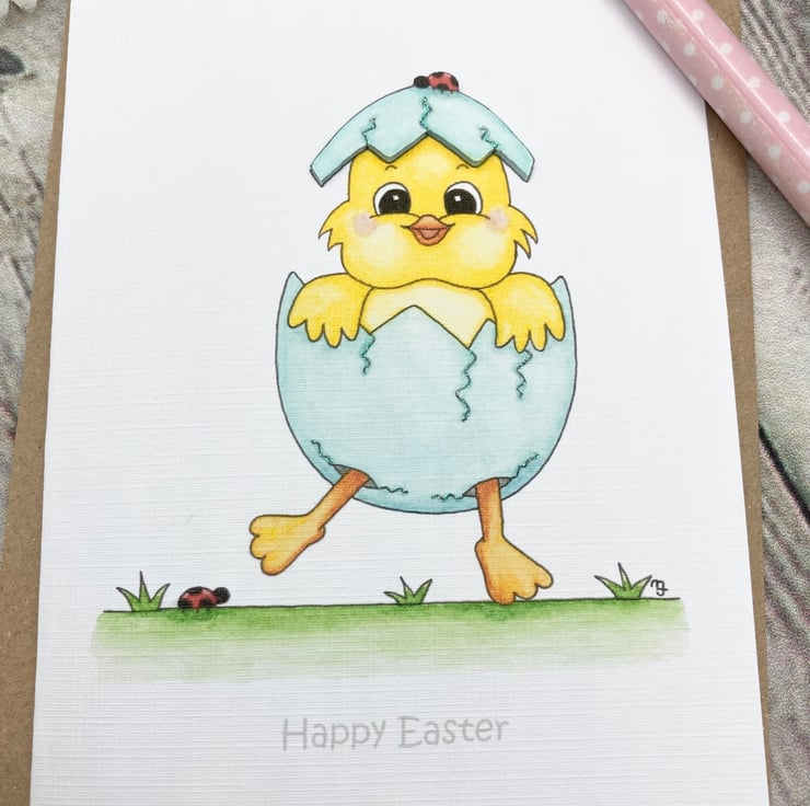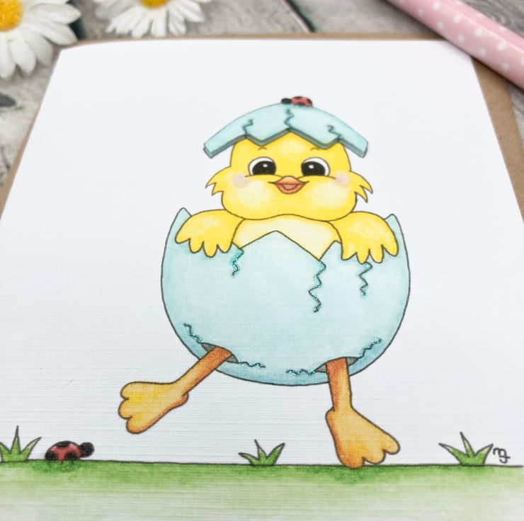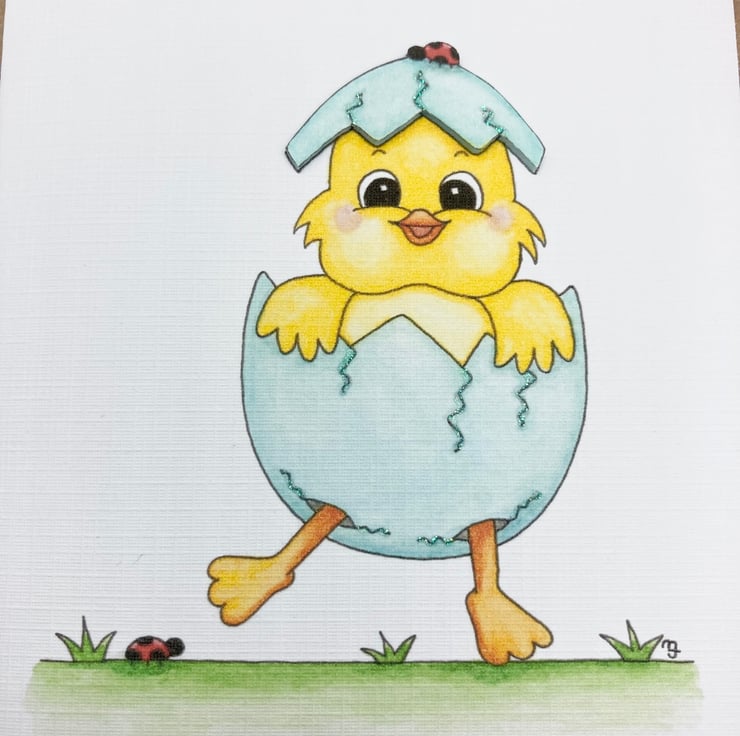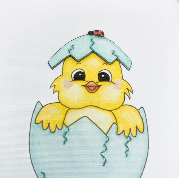 This cute Easter Chick card has been designed using my own original illustration. The image has been printed out onto good quality white linen embossed card and decoupaged up in parts. I have also added a little glitter detail.