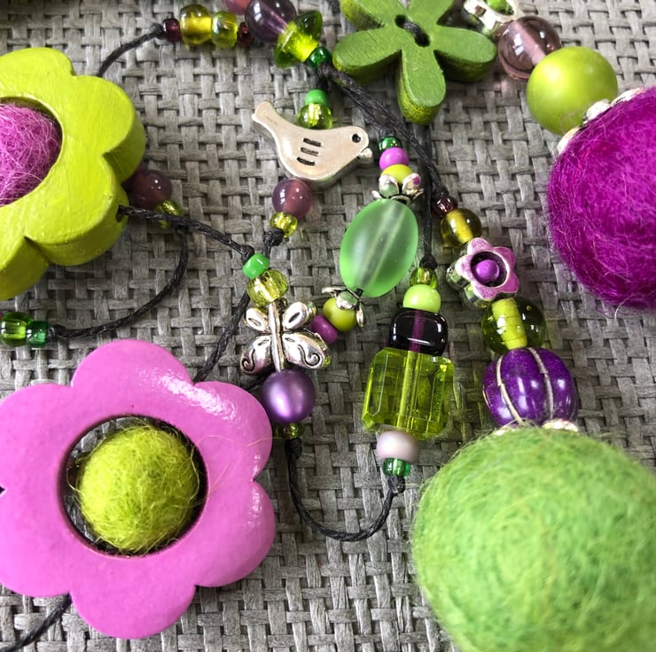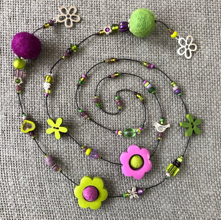 Lariat necklace featuring a glorious mixture of beads in shades of purple, lilac, lime green and leaf green. The beads include large and small painted wood flowers, felt balls, glass, Polaris and wooden beads, as well as antique silver tone bird, butterfly and flower beads. The necklace is finished at the ends with antique silver tone flower charms and is strung on strong, flexible waxed linen thread.