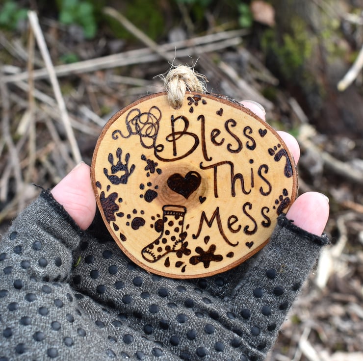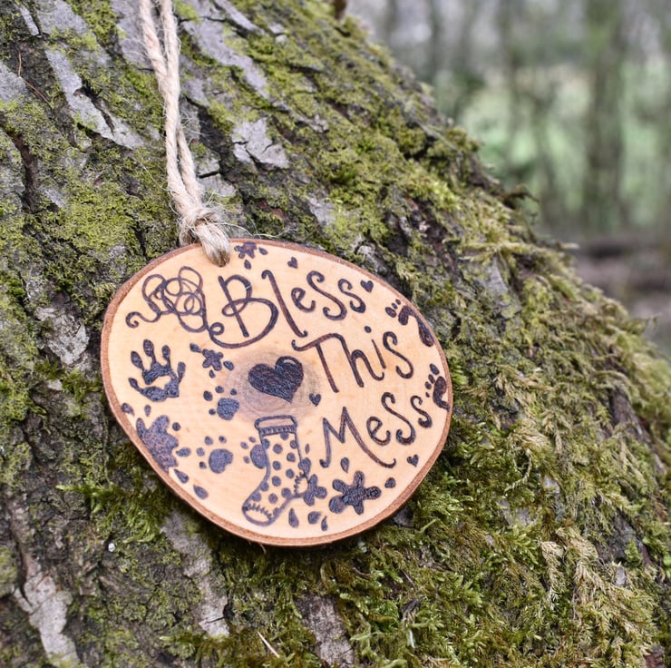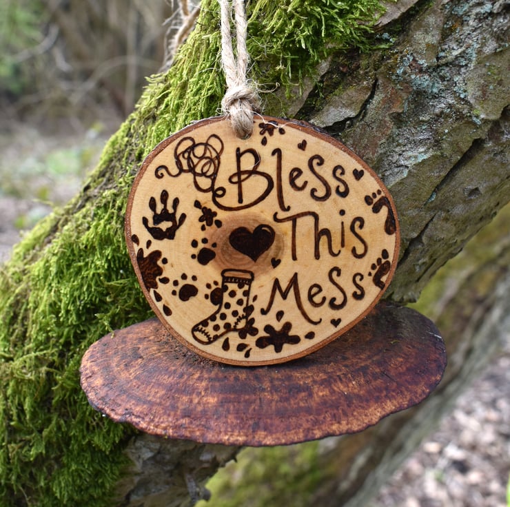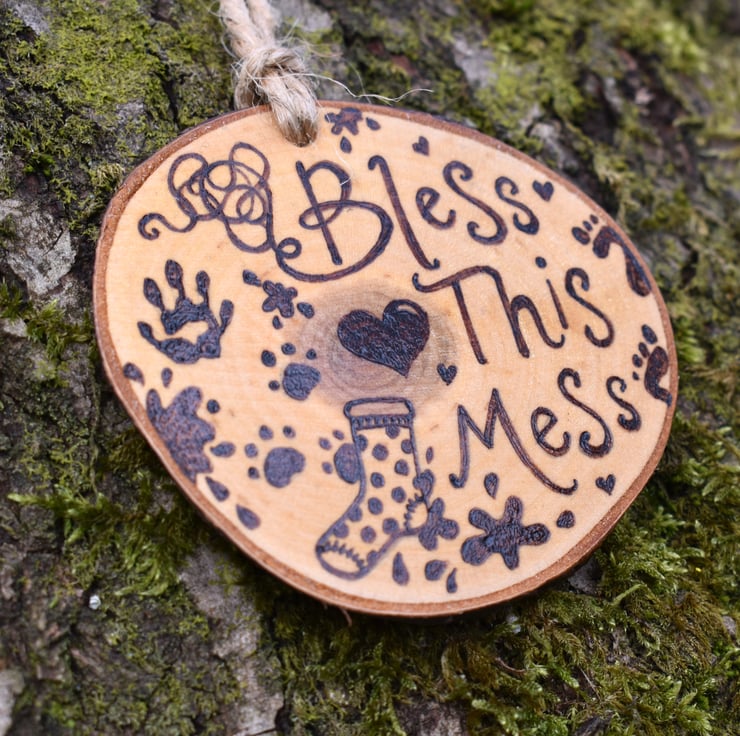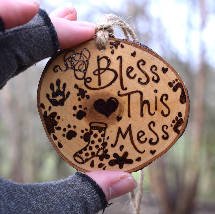 A beautiful wood burned decoration for the home reading featuring the words 'Bless this Mess'