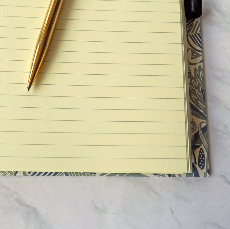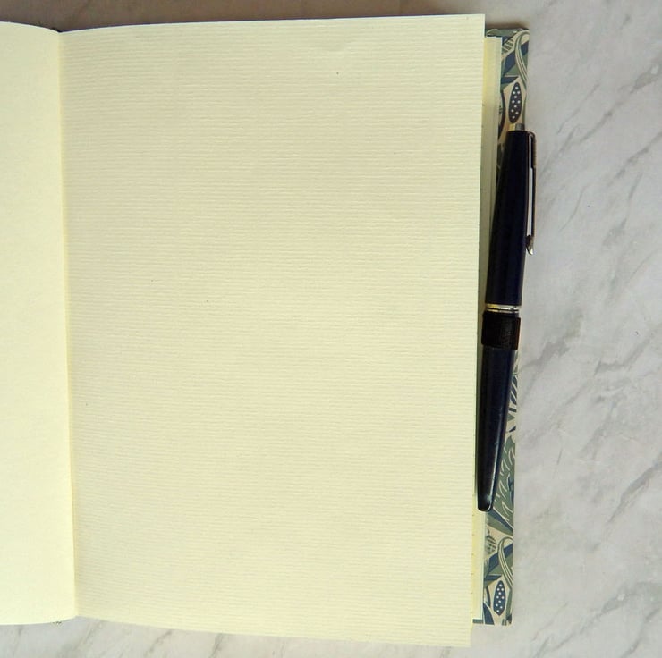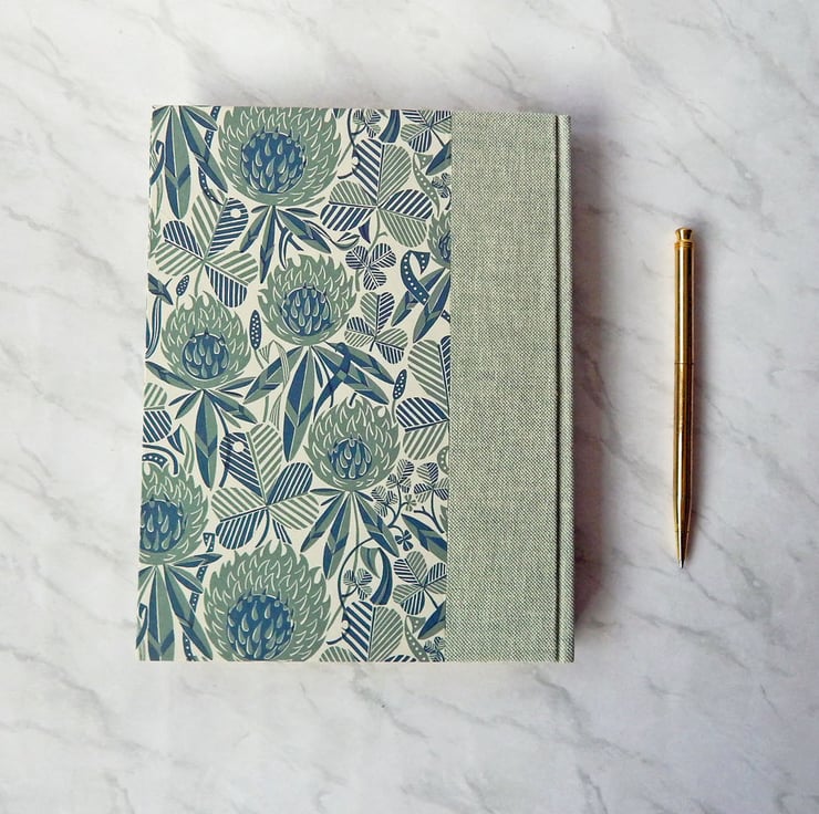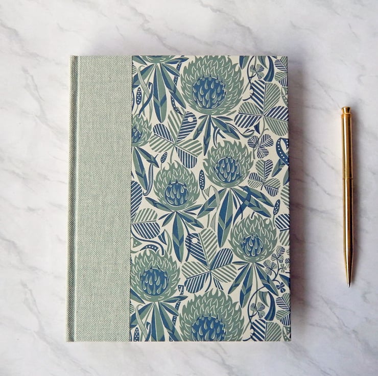 A traditionally made hard cover journal with clover patterned covers trimmed with linen.