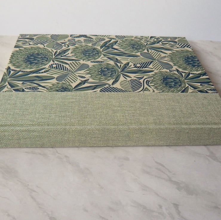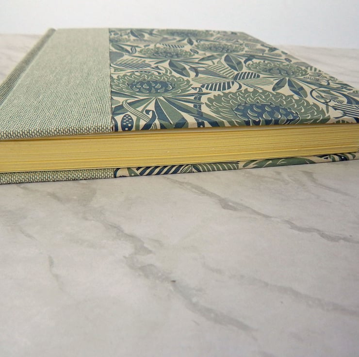Hand bound, using a traditional German Bradel binding, the covers are of "Clover" paper designed by Angie Lewin, trimmed with eau de nil / blue-grey linen.