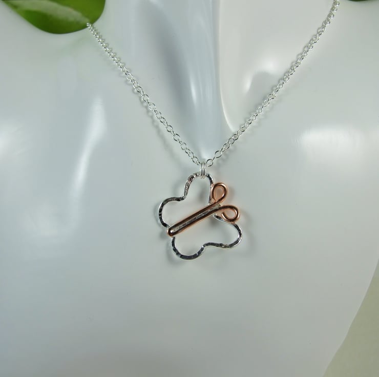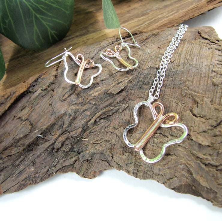 I have created the butterfly pendant from 1.5mm thick sterling silver wire, formed by hand into a butterfly shape, the body and antennae are made from 1mm copper wire, also formed by hand and soldered in place. The earrings are made from 1mm thick sterling silver wire, formed by hand into butterfly shapes with 0.8mm copper wire for the body and antennae