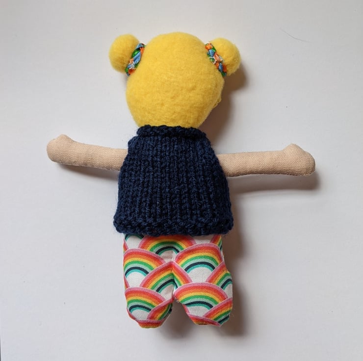 She is stuffed with polyester toy stuffing and her eyes are hand-painted using acrylic paint.