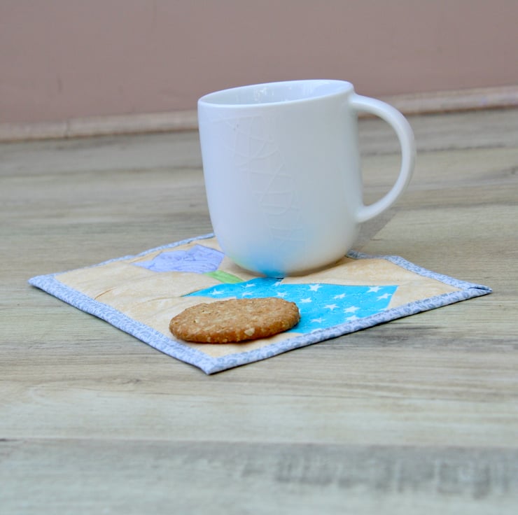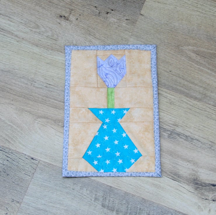 This beautiful mug rug, featuring a blue tulip in a vase, is big enough to accommodate your drink and a cheeky biscuit.
