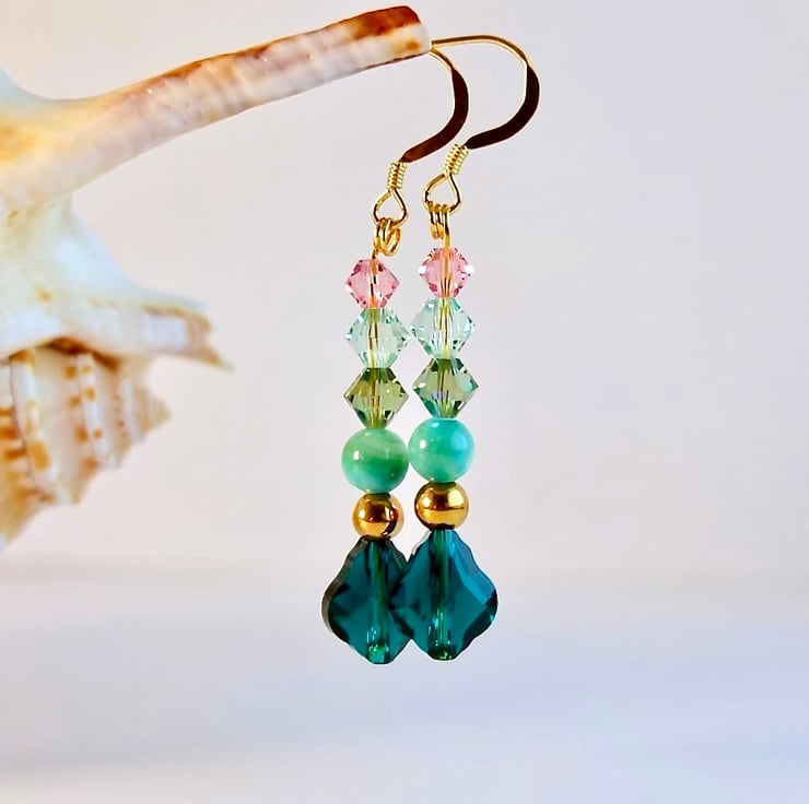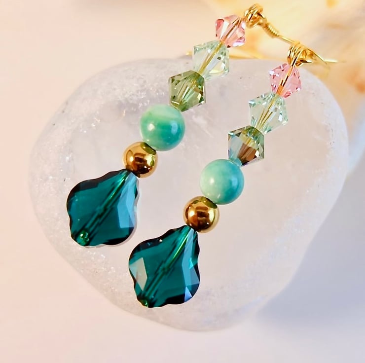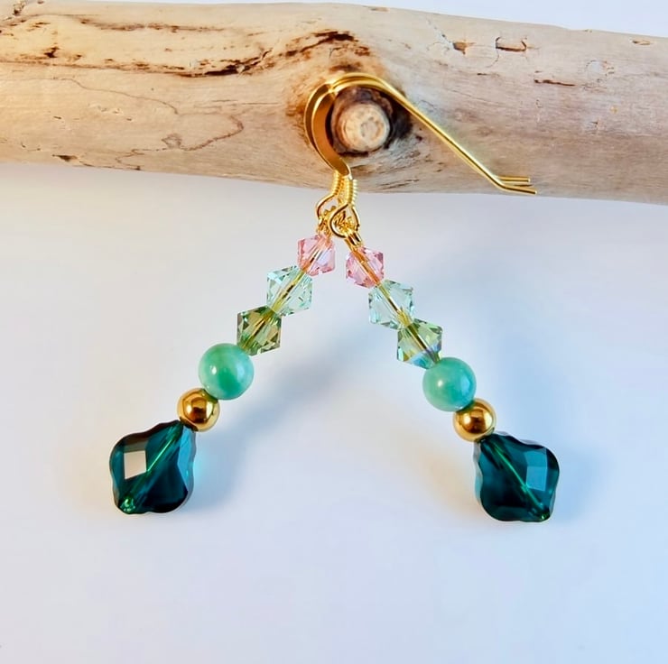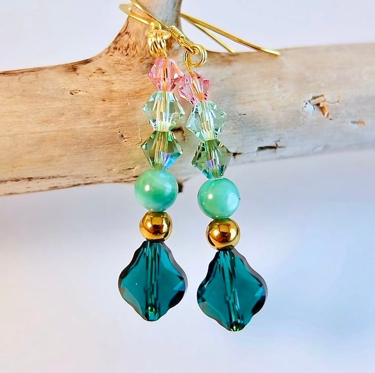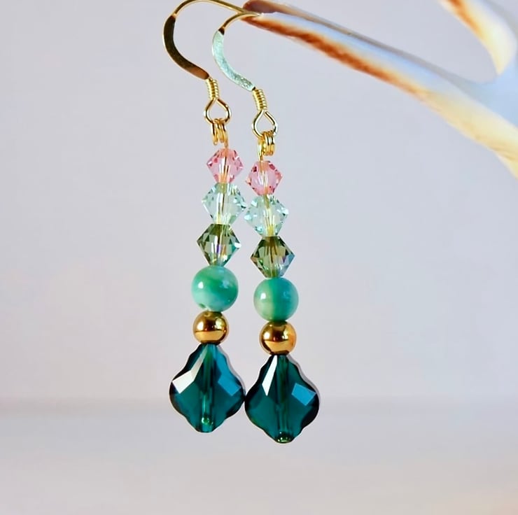 Pretty, glittering, colourful earrings featuring a Swarovski 10mm Baroque "emerald" drop that catches the light beautifully.