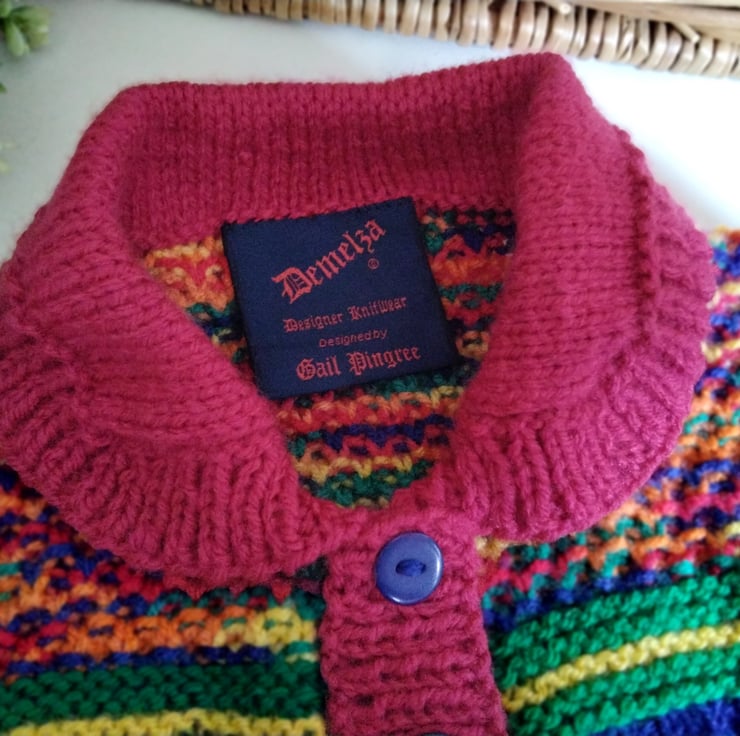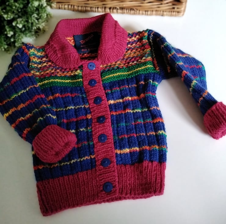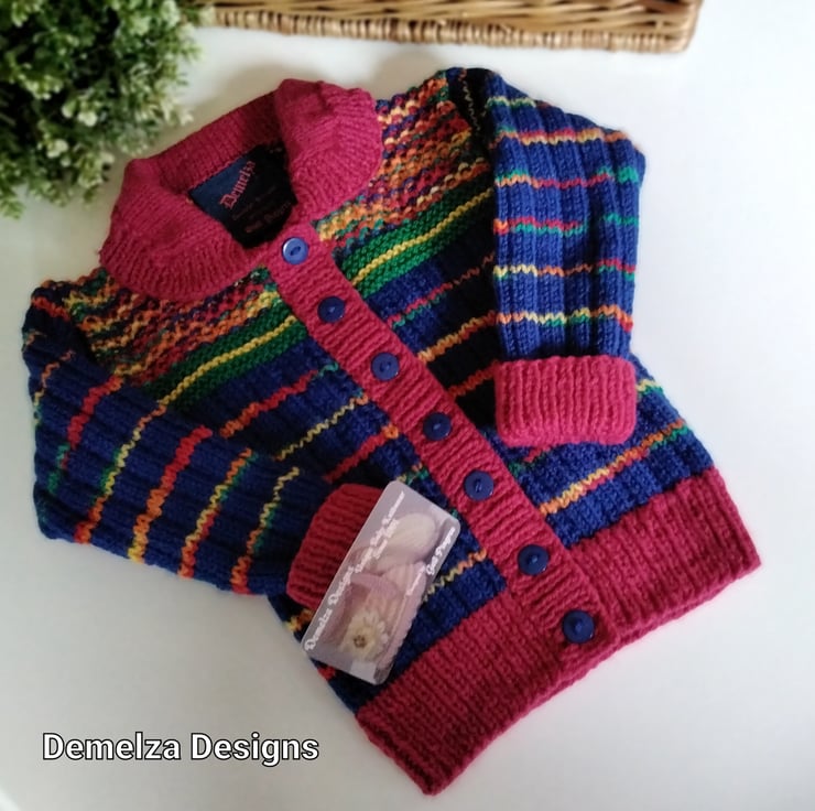 A practical everyday wear cardigan designed and lovingly hand crafted using quality branded British manufactured yarns. The yarns are machine washable at low temperature. The buttons are navy blue. The item has the branded Demelza garment label attached to the back neck edge with the care instructions woven on the reverse side. I have designed it to be a slim fit for those toddler's with a tall slim body. Many mothers report some mass produced cardigans can look baggy on their children, so this one fits the bill and has a slight stretch around the body for a perfect cosy fit as the child fills out.