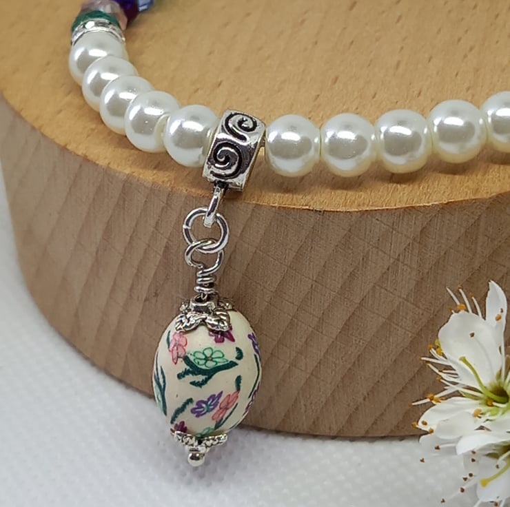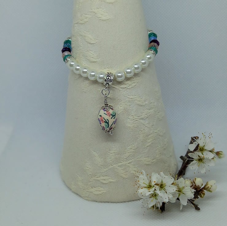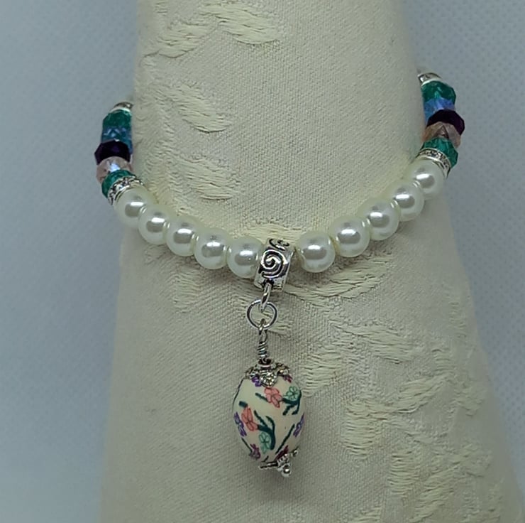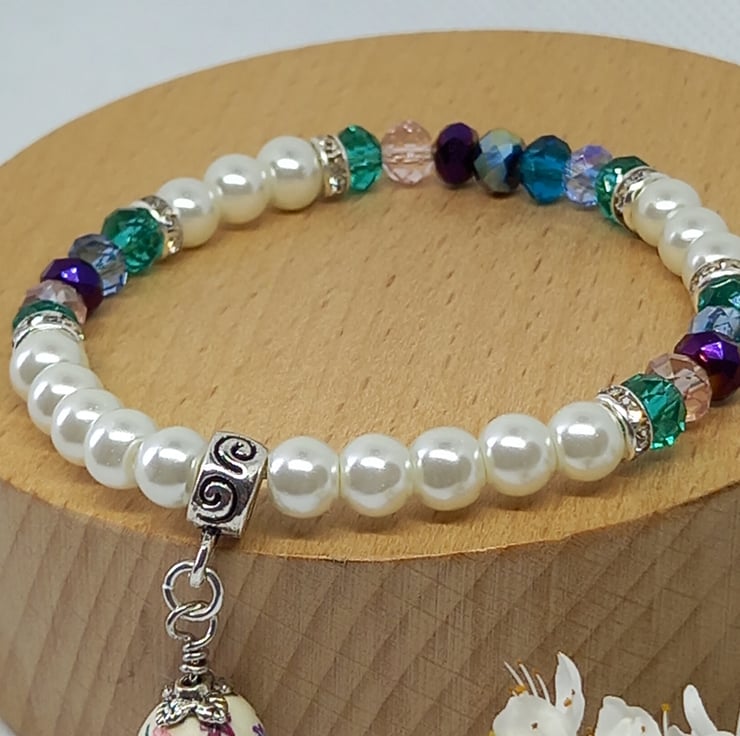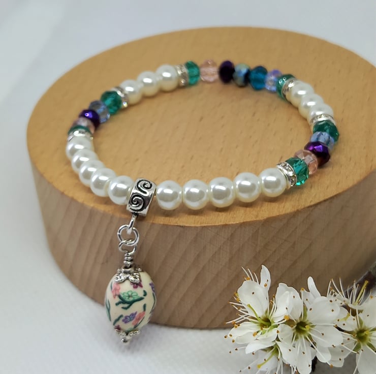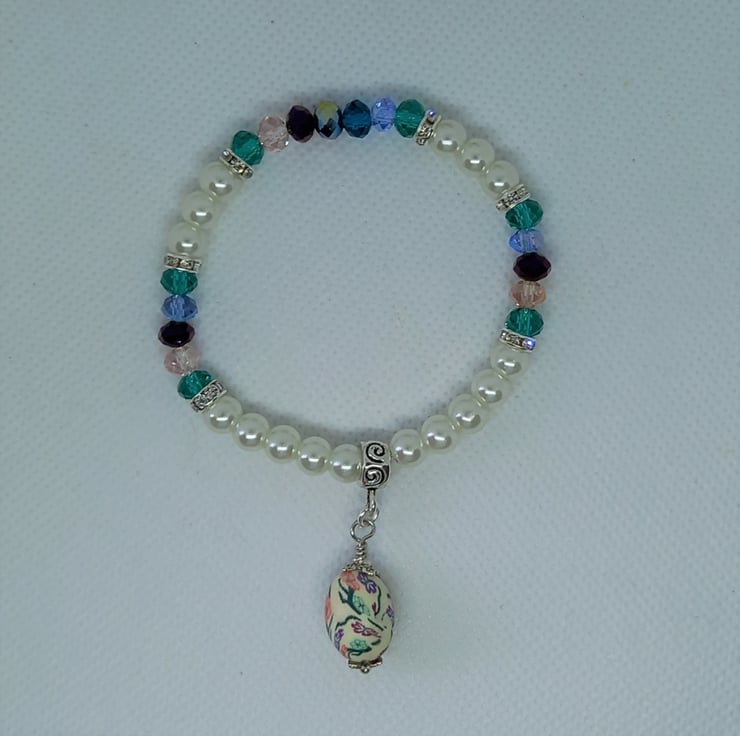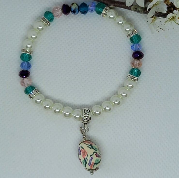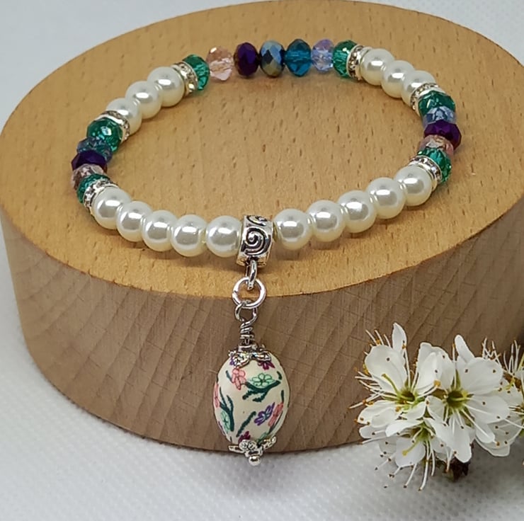 A polymer clay bead, formed into a charm brings to mind cottage gardens. Complemented by cream glass pearls, glass rondelles in toning shades including pale blue, emerald and purple, with diamante spacers. All the beads are threaded onto strong jewellers' elastic and the oval charm is suspended from a swirl pattern charm carrier. The bracelet has an internal measurement of 6.5 inches.
