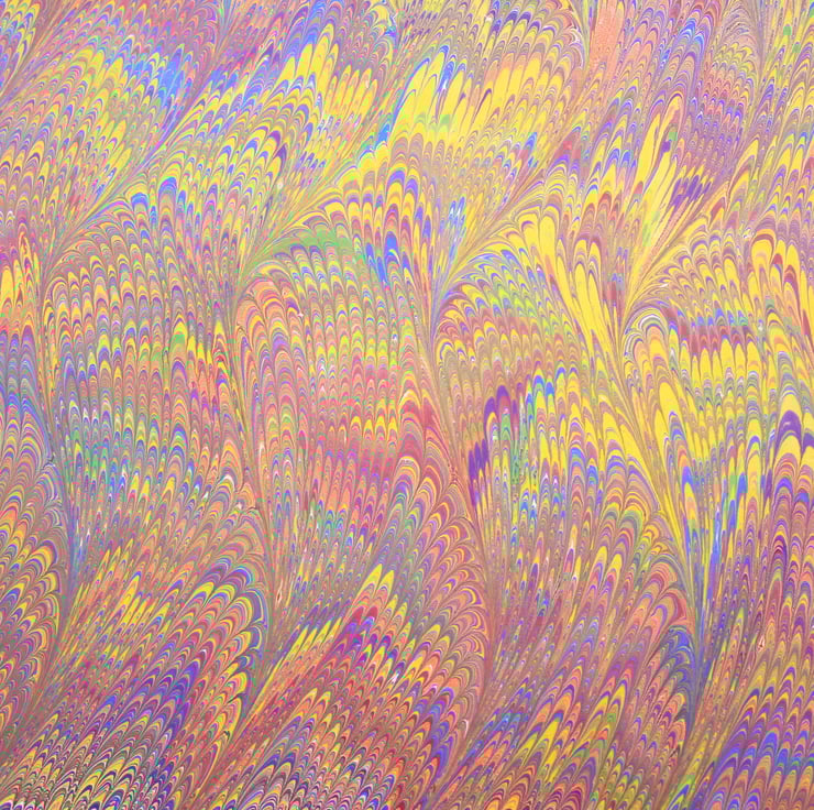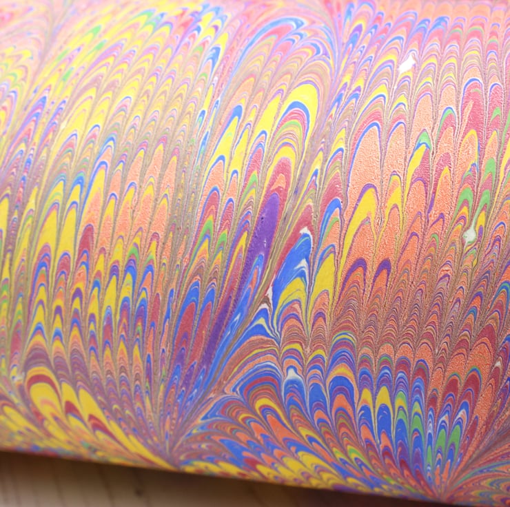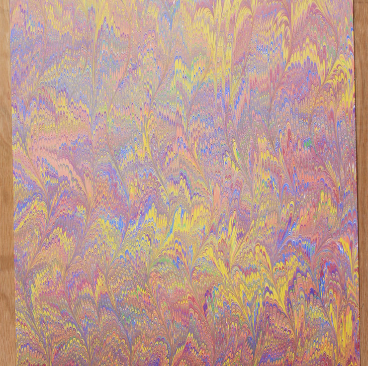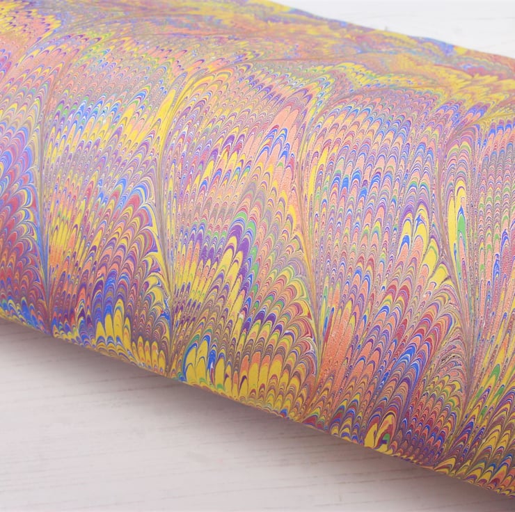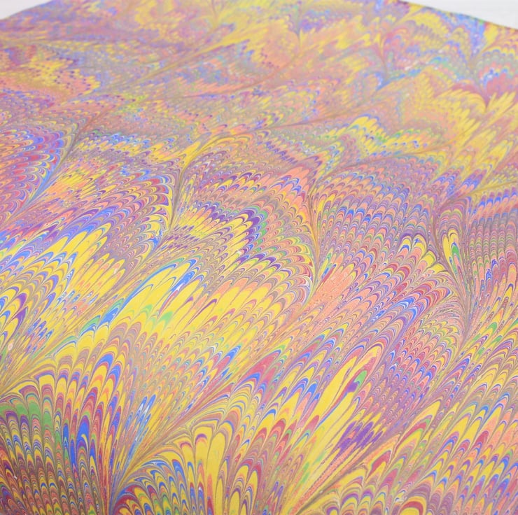 Every one of the sheets I sell are handmade by me from start to finish. there may be some very small blemishes in the pattern, this is part of the nature of hand marbled papers and are part of the charm. Most papers will also have a certain amount of paint on the reverse, this is unavoidable but does not affect the performance of the paper.