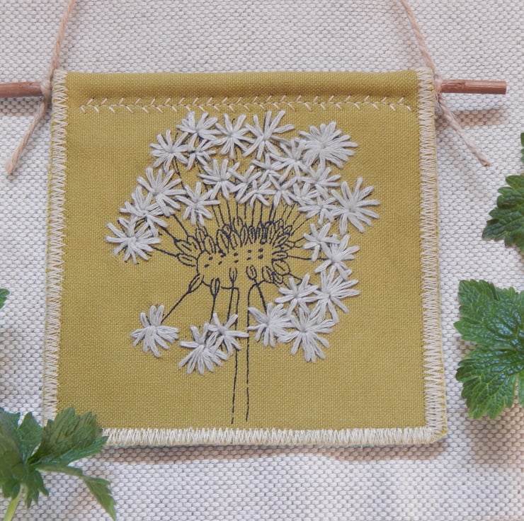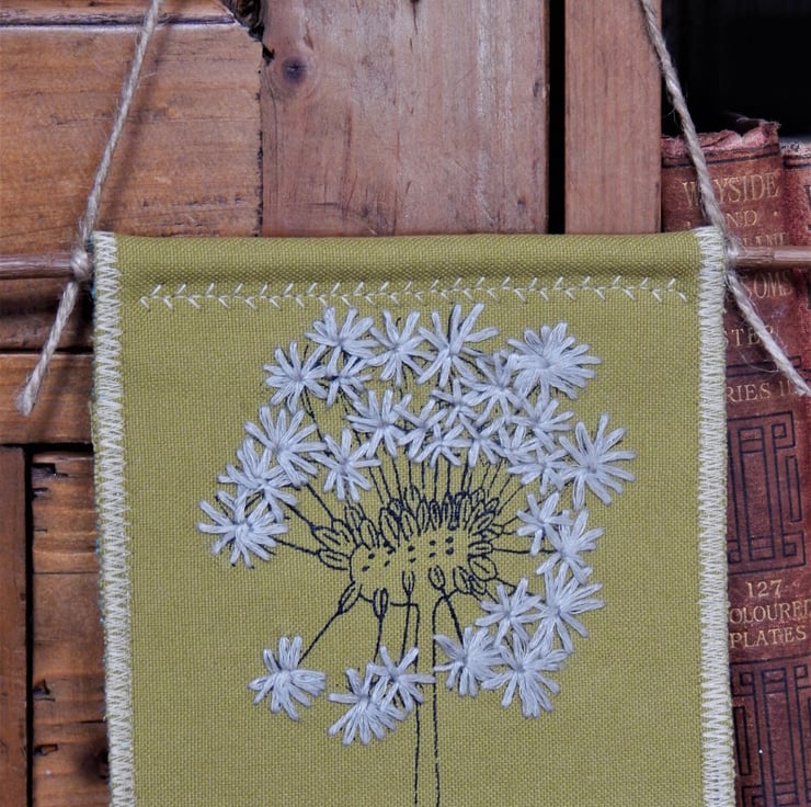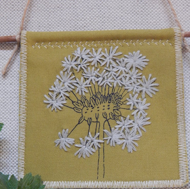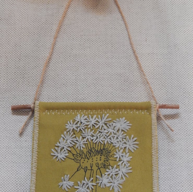 This is a dandelion clock that has been screen printed onto olive green cotton. I have hand embroidered the seeds. This has a couple of layers of cotton fabric for some stability and this is sewn onto a piece of willow, a simple hanging loop is made with a piece of hemp string connected from one end of the willow to the other.
