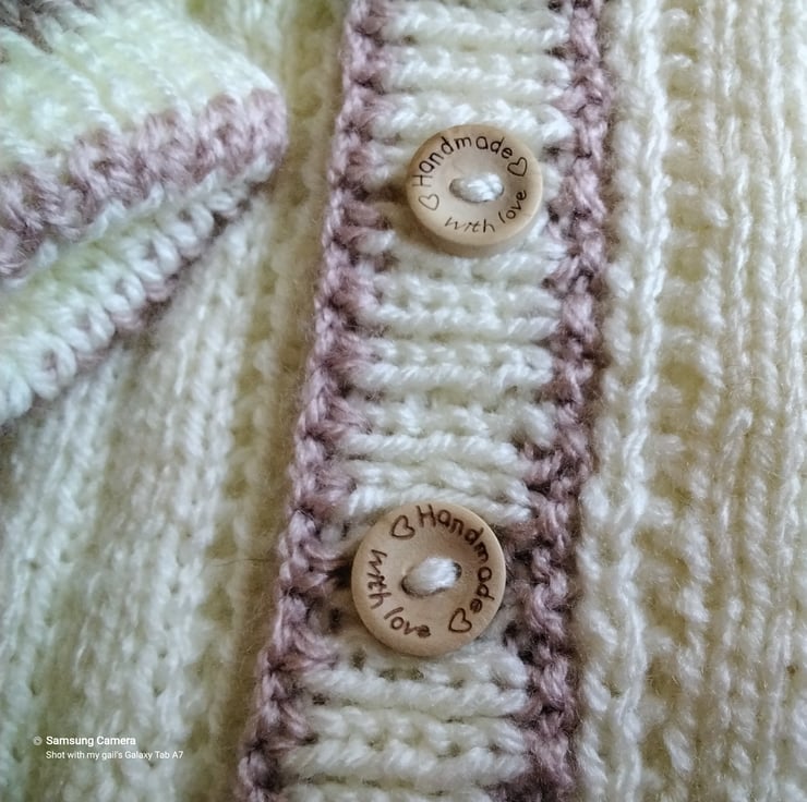 A practical everyday wear cardigan designed and lovingly hand crafted using quality branded British manufactured yarns. The yarns are machine washable at low temperature. The buttons are made from genuine wood with a sweet sentimentburntetched on them. The item has the branded Demelza garment label attached to the back neck edge with the care instructions woven on the reverse side.
