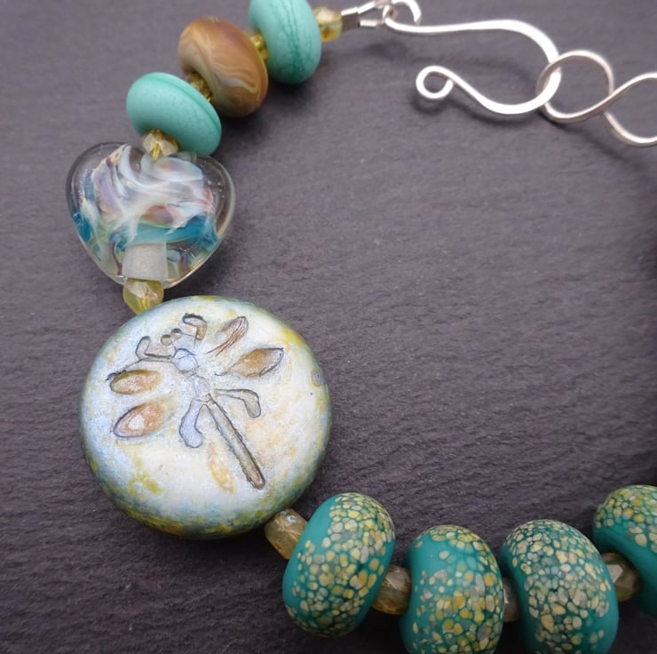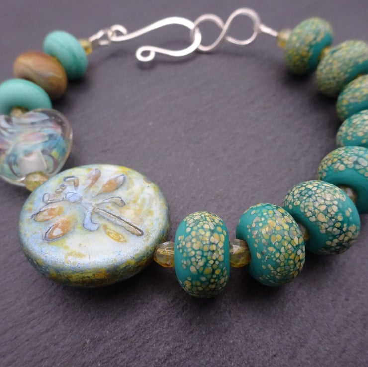 A bracelet made using handmade lampwork glass beads, a green dragonfly Czech glass bead and golden Czech glass beads.