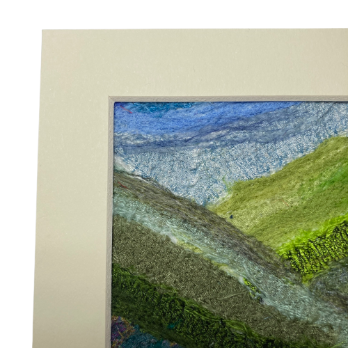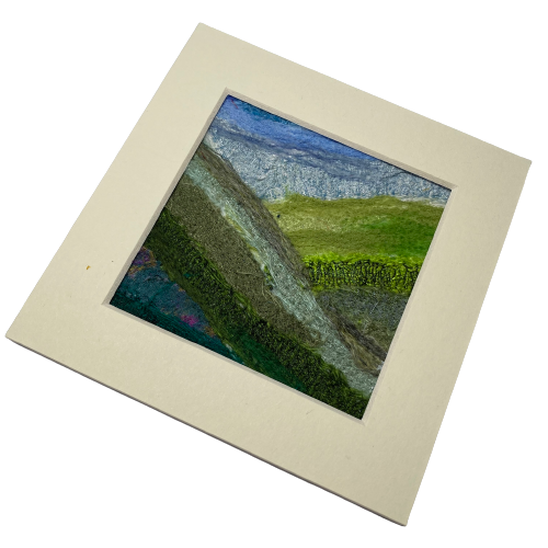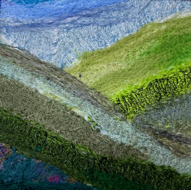A piece of textile art formed using silk fabrics and woollen fibres. Strips of coloured silk fabric and various wool and silk fibres have been needle felted onto a felt background. This process binds the fabric and fibres to the backing felt without the need for stitching. In addition to binding the fabrics, the needle felting creates a beautiful texture to the surface of the picture, with the raw edges of the fabric left exposed in places to add to the artwork.