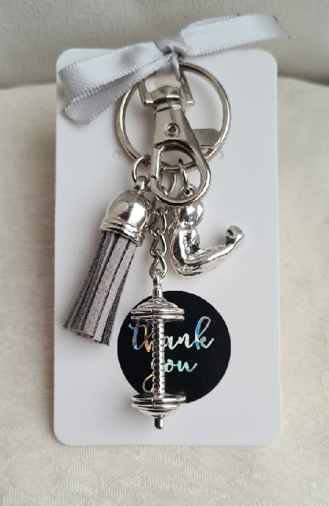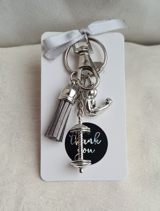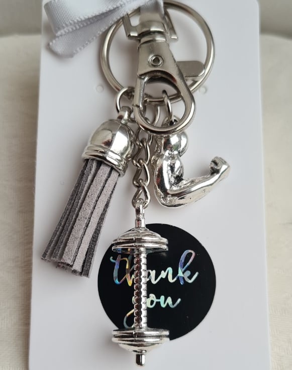 A great gift for the Gym-goer in your life. A lovely key ring with Barbell, Flexed muscle arm and silver grey tassel. This can be clipped on your sports bag or for your keys a fab fitness themed gift.