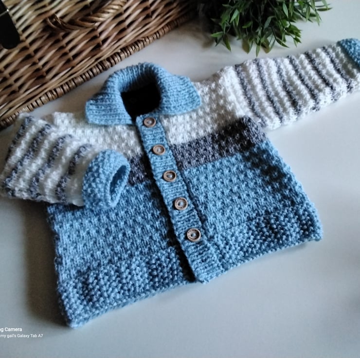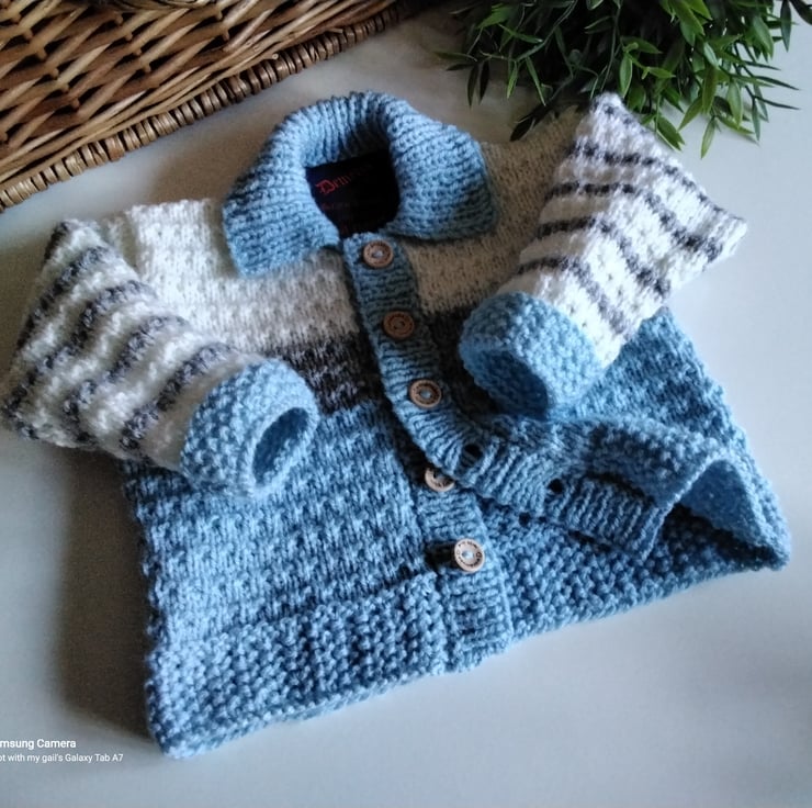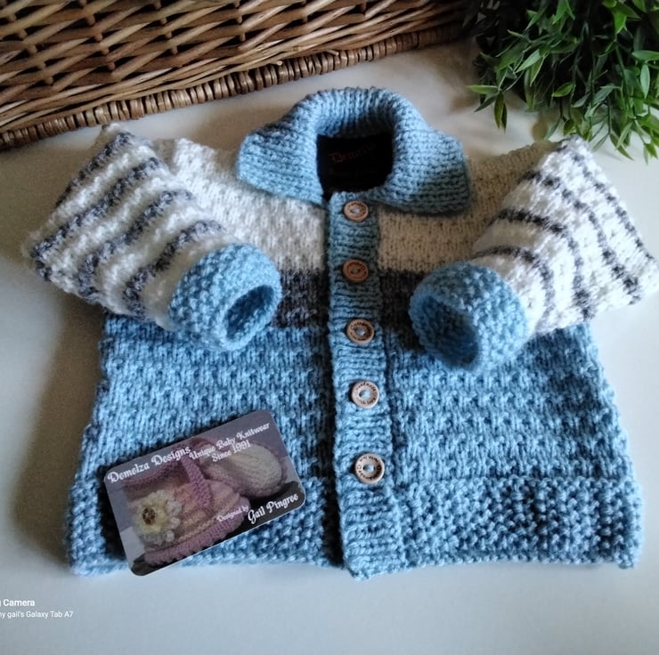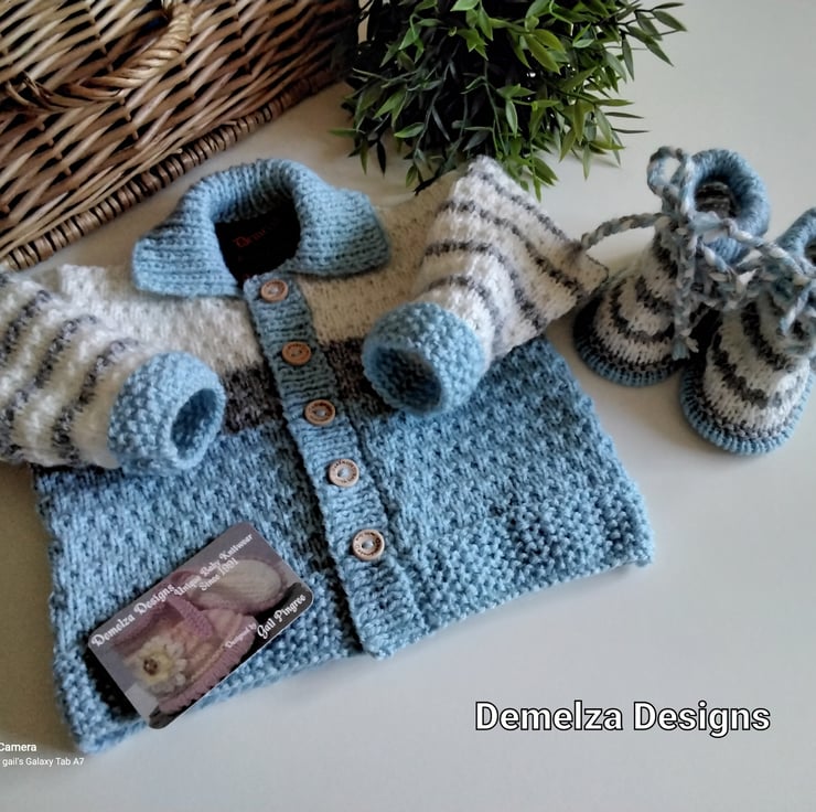 A unique practical baby boy's jacket and bootie set lovingly designed and hand crafted using quality British branded machine washable mixed fibre yarns containing 20% Merino wool with 80% premium acrylic. It will make a perfect designer newborn or baby shower gift for parents whom are known to value and appreciate genuine hand crafted products in general for total individuality. The garment tag is attached to the back neck edge which has the care instructions woven within it and as proof if it's origins. The booties are high above the ankles with thick hand platted ties.