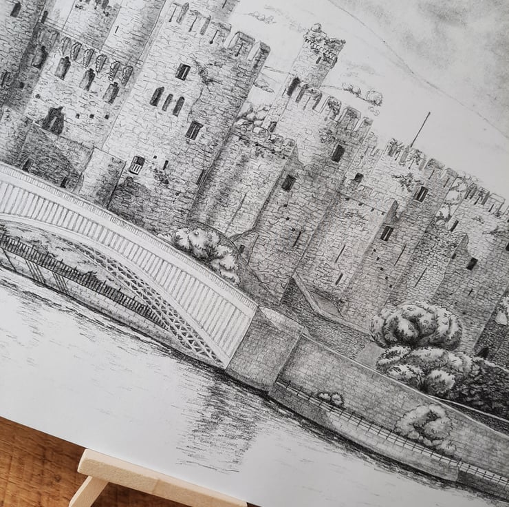 This item is printed from my own original pencil drawing. The original photo references was taken from across the estuary on a bright sunny day. The sun creating wonderful shadows on both the castle and bridge.
