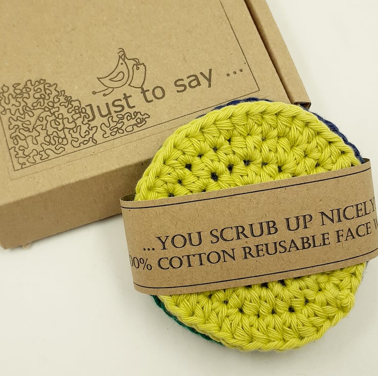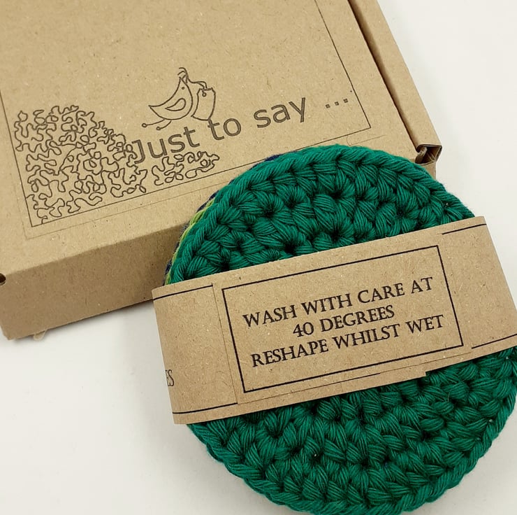 The set of scrubbies comes wrapped in tissue in a labelled PIP (Postage in Proportion) box and would make a lovely gift and even a novel alternative to a greetings card! The front of the box reads 'Just to say ... and the label around the scrubbies finishes the sentence with the words '... you scrub up nicely!'