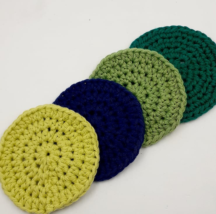 These four pretty face scrubbies are crocheted in cotton and measure approximately 7.5 cm in diameter. Perfect for use with soap and water or makeup remover. They can be popped in a laundry bag and washed at 40 degrees, reshaped whilst wet and they are ready to use again!