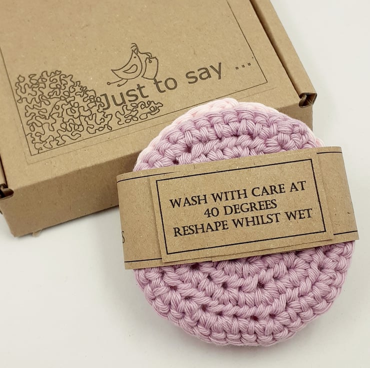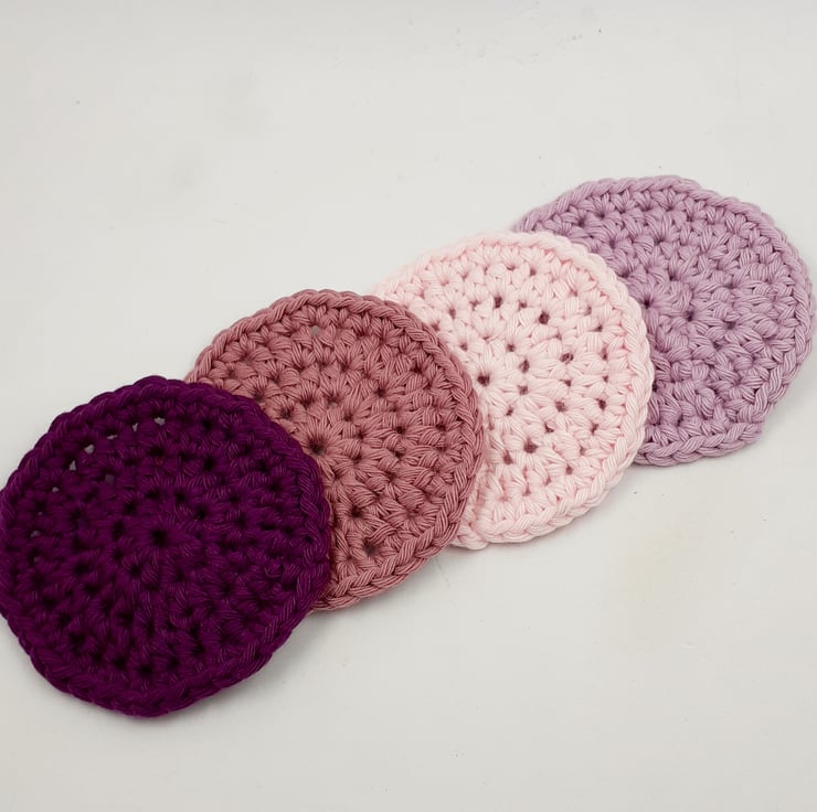 These four pretty face scrubbies are crocheted in cotton and measure approximately 7 cm in diameter. Perfect for use with soap and water or makeup remover. They can be popped in a laundry bag and washed at 40 degrees, reshaped whilst wet and they are ready to use again!
