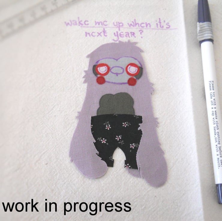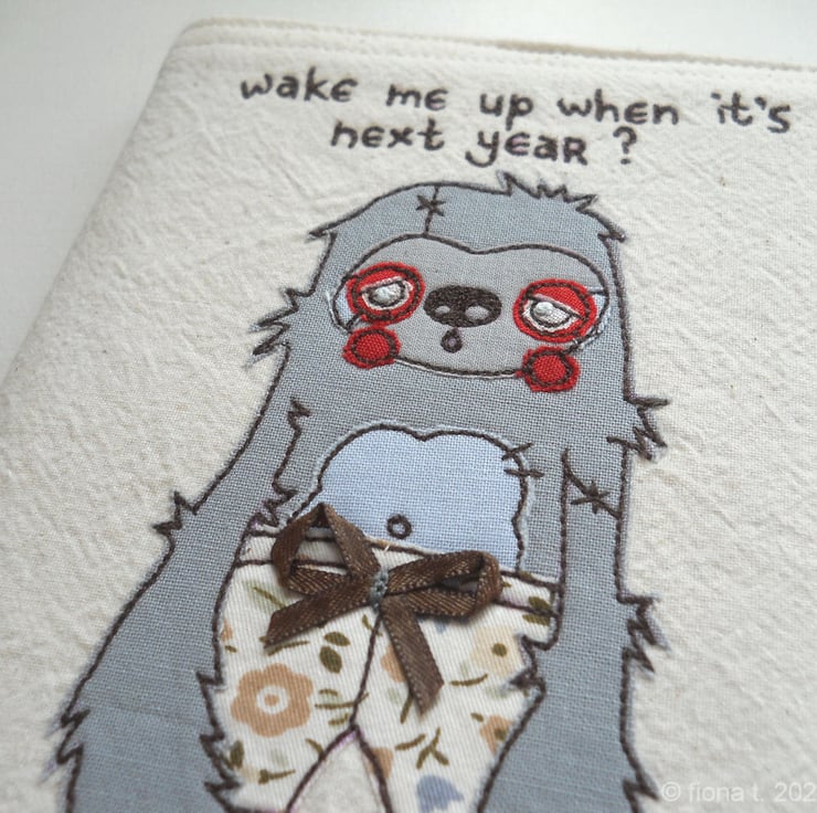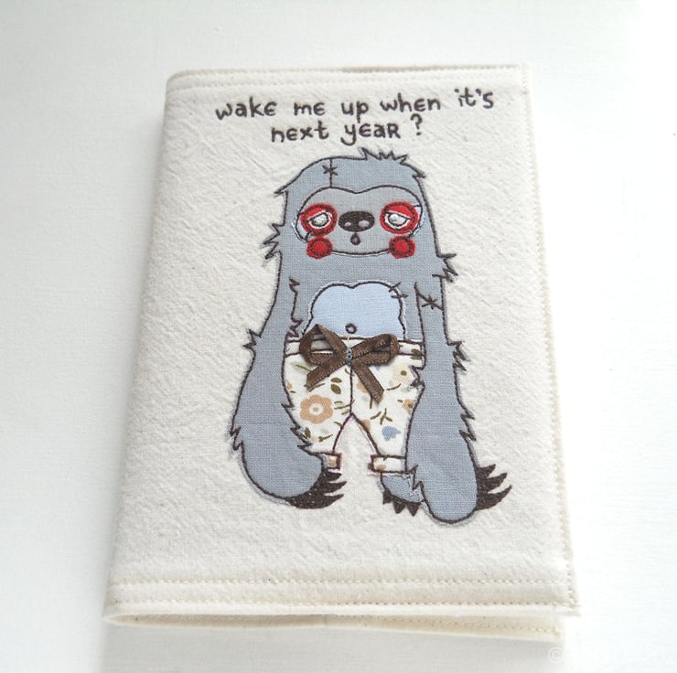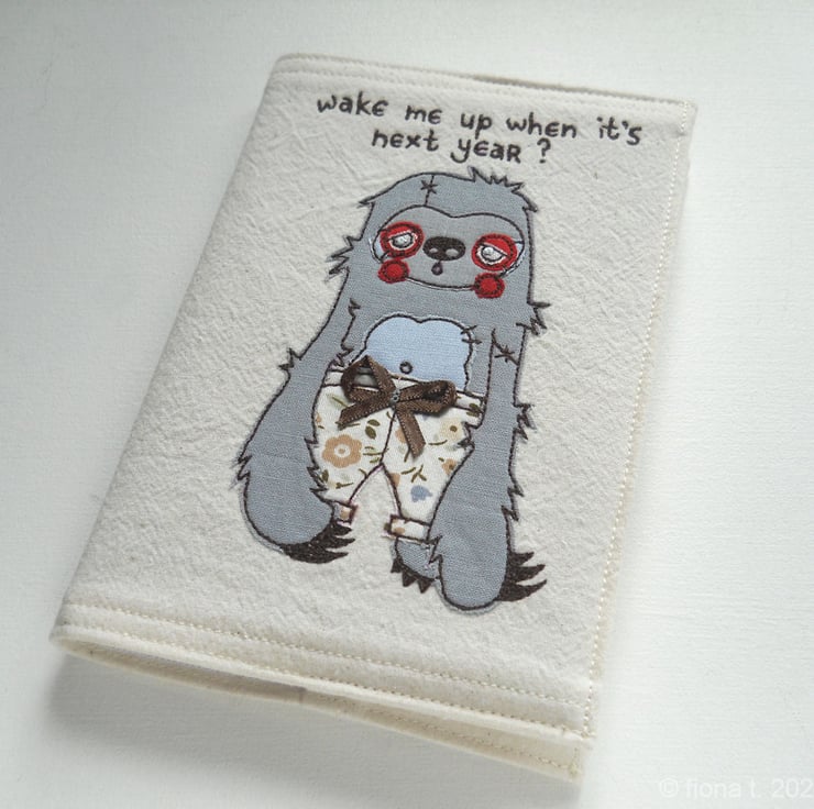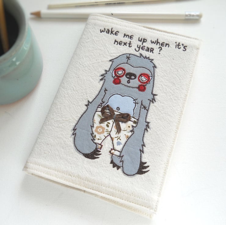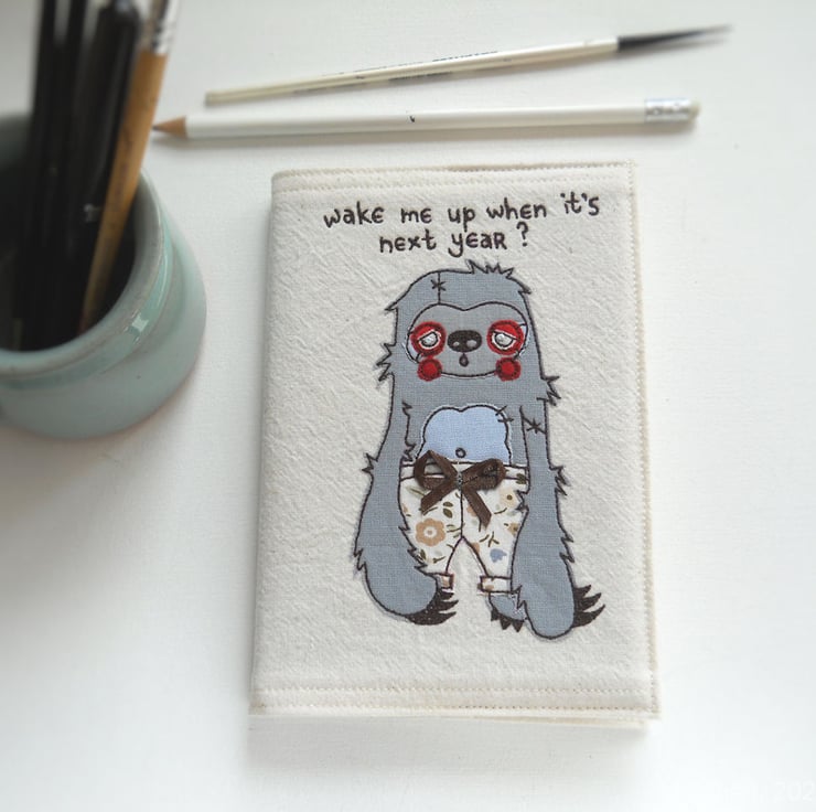 applique & freehand embroidered zombie sloth notebook cover with A6 sketchbook inside.