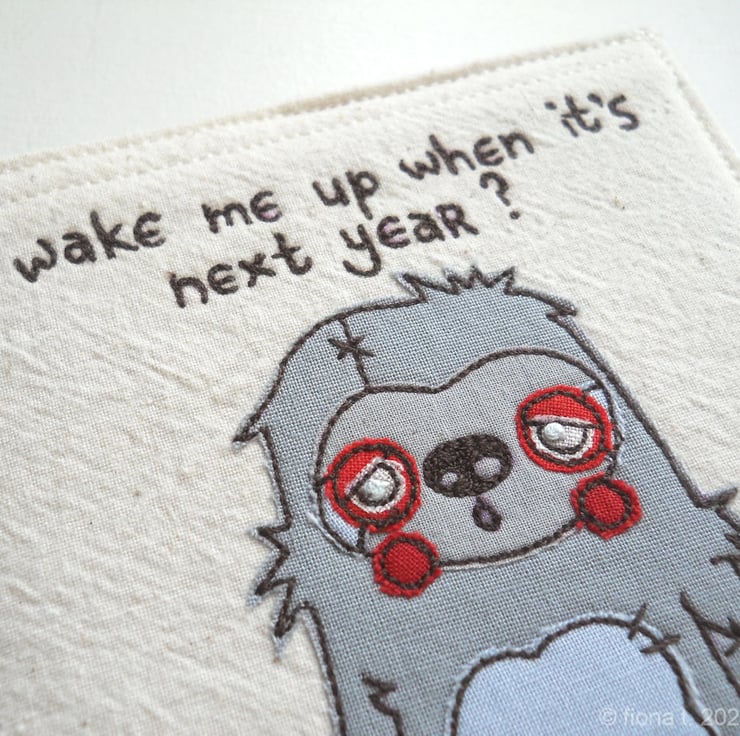 the text “wake me up when it’s next year?” is freehand embroidered.