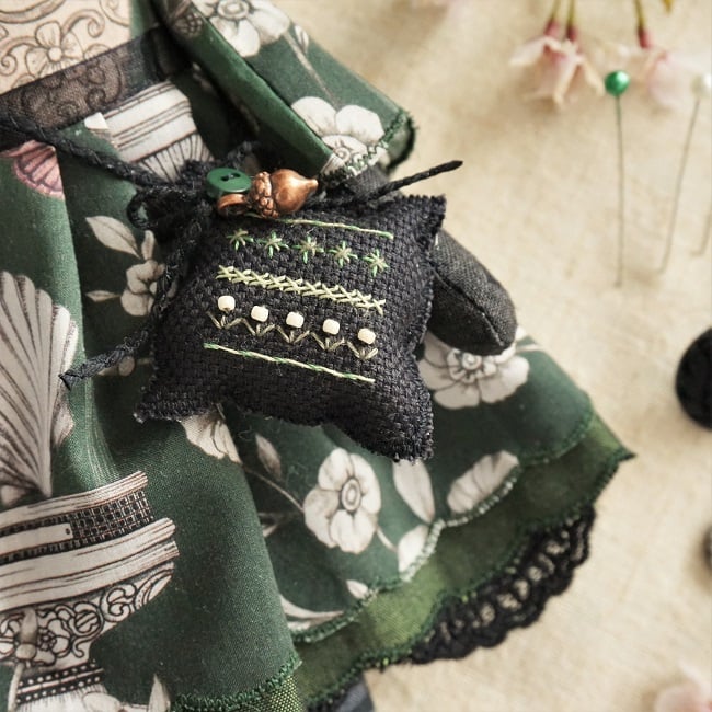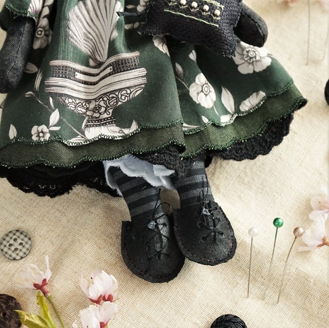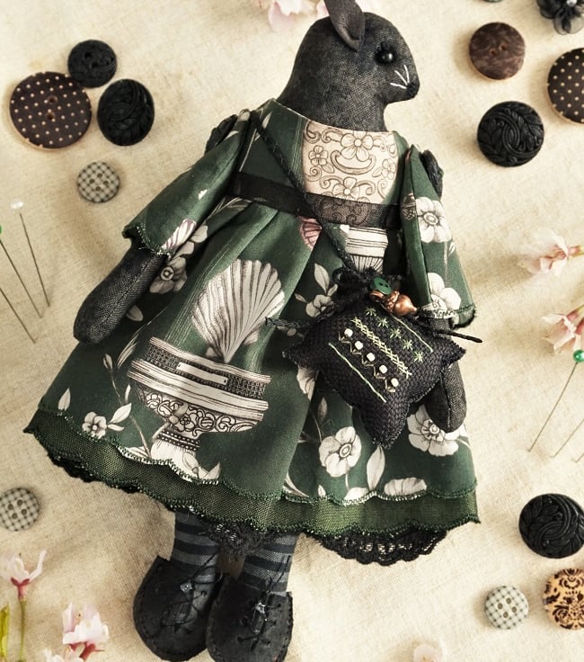 I love colour and I am particularly drawn to the delicate prints you can find in Liberty Tana Lawn, a super light weight cotton. However, sometimes I find myself attracted to less colourful prints and I buy them and never use them. So the midnight series was born, little creatures in blacks and greys with dark prints that please me. This print is The Collector, it strikes me as very victorian with dark greens and all those collecting jars. She is Miriam as I was thinking of great victorian female collectors and I was reminded of Miriam Rothschild and her fleas!
