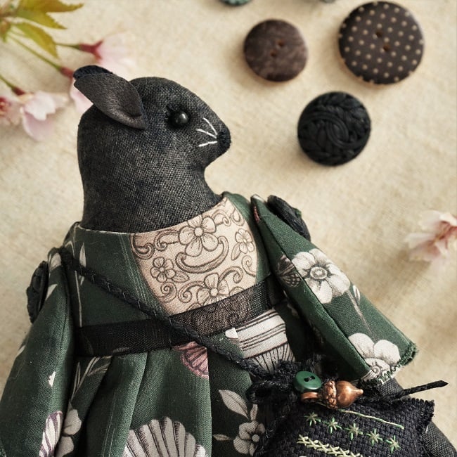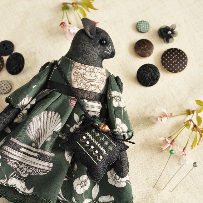 This is Miriam, a tiny midnight mouse. She is a hand embroidered mouse with little leather ears and tail. She is dressed in a Liberty tana lawn cotton called The Collector the midnight version in dark greens with coordinating underskirts in black tulle mesh and white cotton lace bloomers. Her dress is finished with organza ribbon, tiny buttons and little leather shoes. She is a black mouse with black ears and tail, grey wishkers and an embroidered black nose.