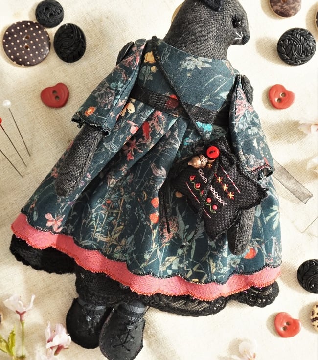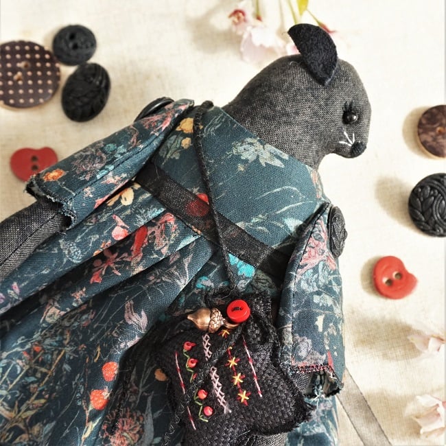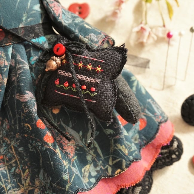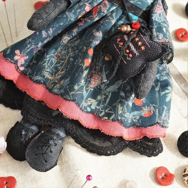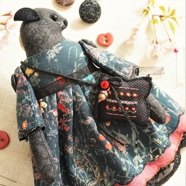 This is Gypsy, a tiny midnight mouse. She is a hand embroidered mouse with little leather ears and tail. She is dressed in a Liberty tana lawn cotton called Wild Flowers the midnight version in black with bright dots of flowers and fruits. She has coordinating underskirts in black tulle mesh and white cotton lace bloomers. Her dress is finished with organza ribbon, tiny buttons and little leather shoes. She is a black mouse with black ears and tail, grey wishkers and an embroidered black nose.