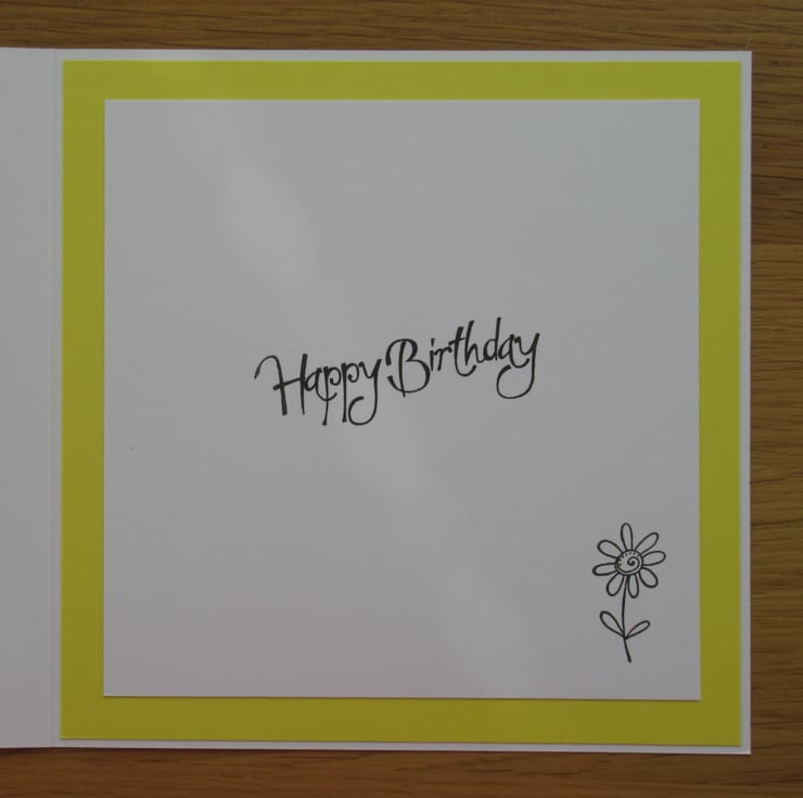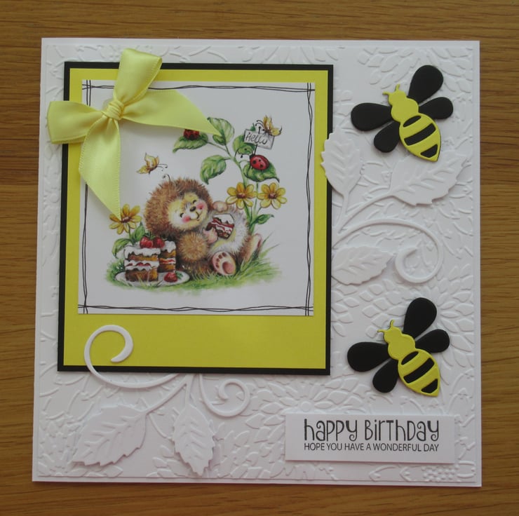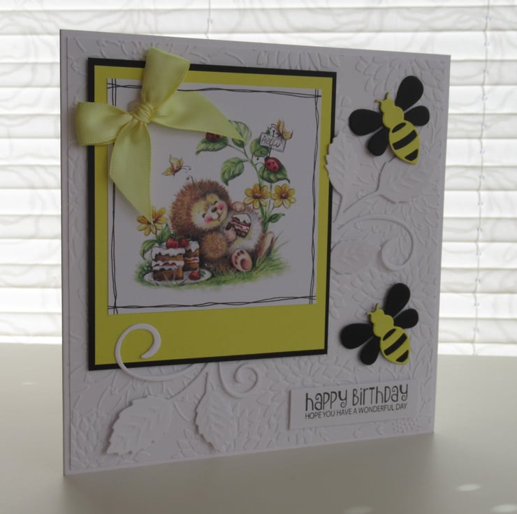 This pretty card features the image of a cute hedgehog lying in the garden eating a huge birthday cake. The square image has been mounted onto bright yellow card to give the effect of a polaroid picture and the card is decorated with foliage and bees which have been die cut by me and a pretty yellow ribbon. The background card has been embossed for texture and the embellishments are raised in places for added depth. The inside has been finished to coordinate with a stamped Happy Birthday greeting.