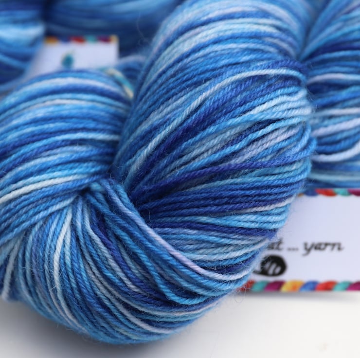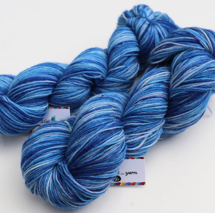 Cool blues. This is a standard 4-ply 'sock' yarn with a nylon content to add robustness. There are two skeins available, price shown is for one. Photos have been taken and edited in bright natural light.