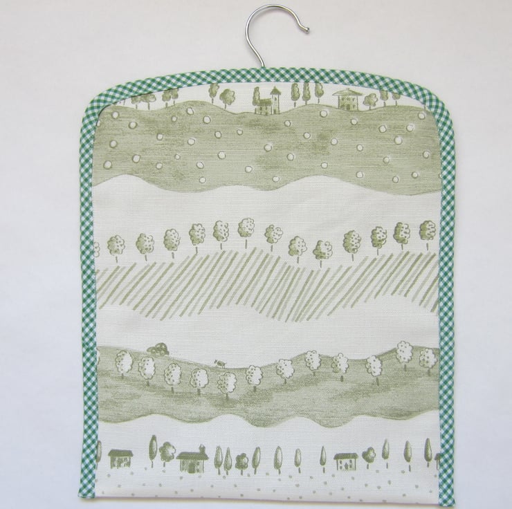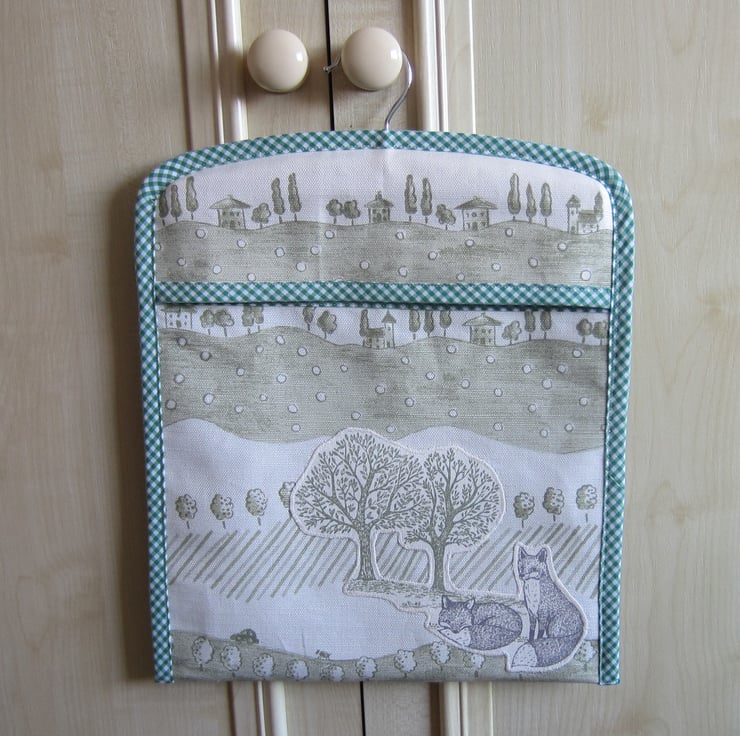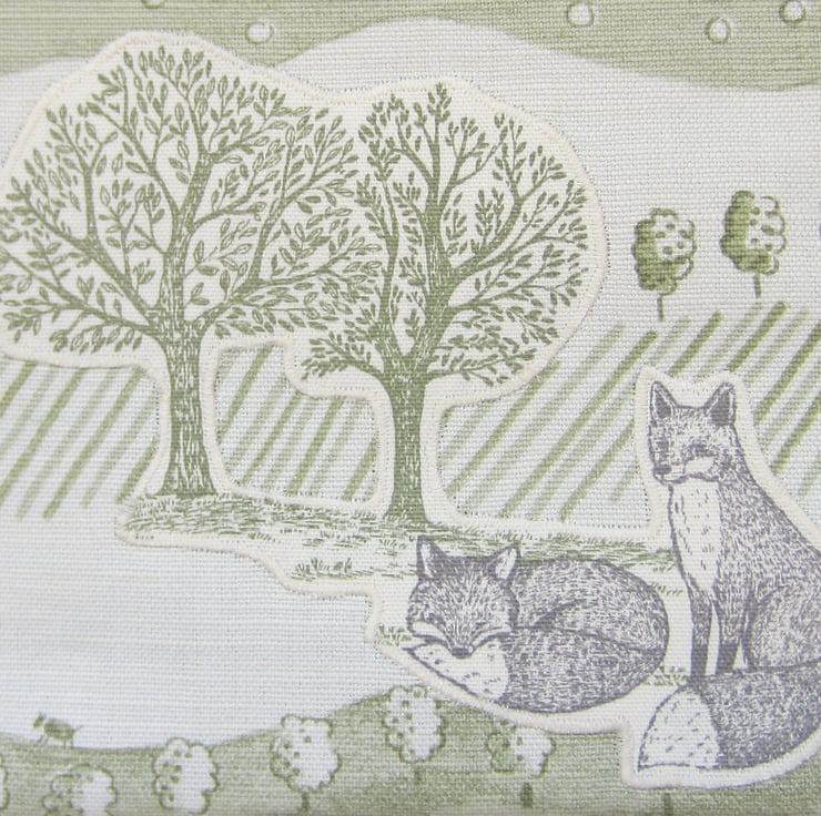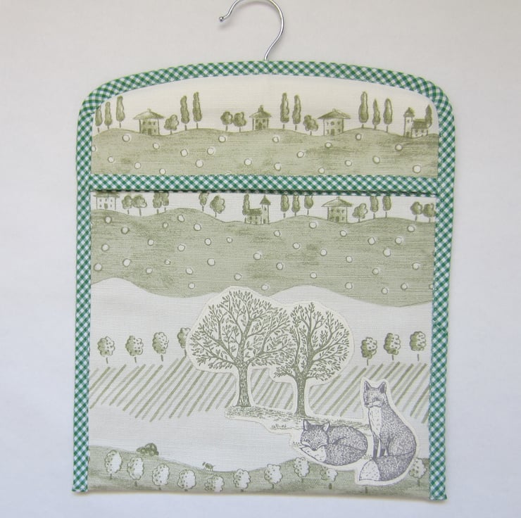 This sturdy peg bag is made with a green and cream trees and houses fabric and appliqued with two foxes and trees.