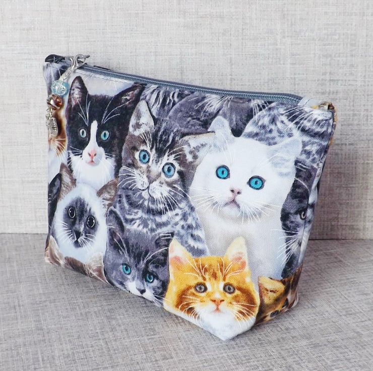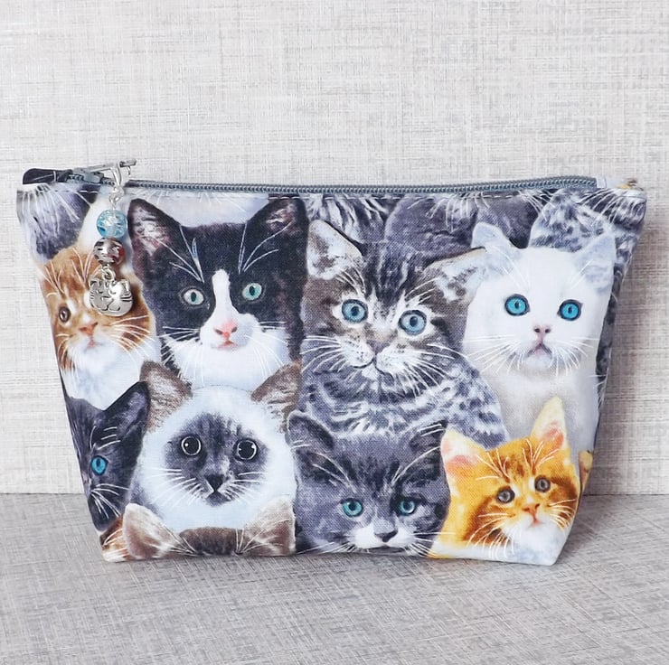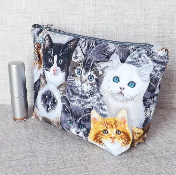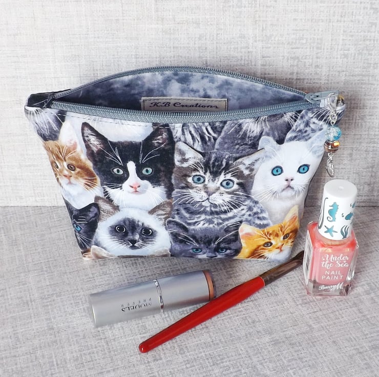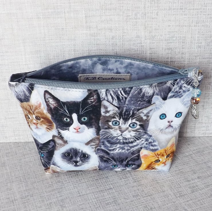 A medium sized make up bag made from cotton fabric with a cat design, in shades of black, white, grey, gold & blue. The lining fabric is grey marbled effect cotton.