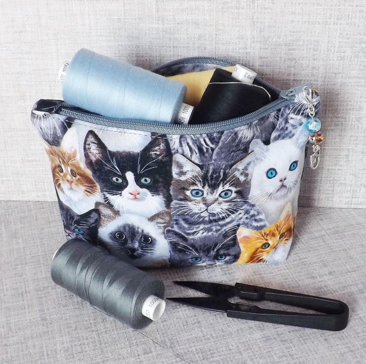 The main fabric has been backed with fusible interfacing to give body to the bag, and there is a zip closure on the top with a bead & cat charm on the zipper pull.