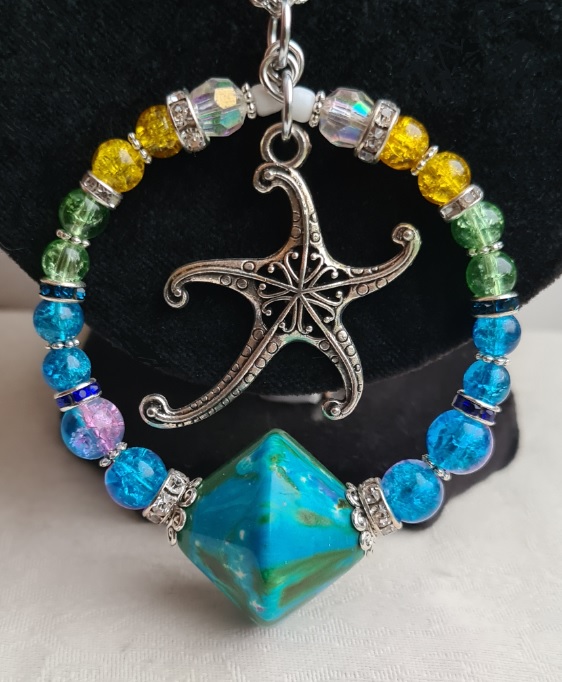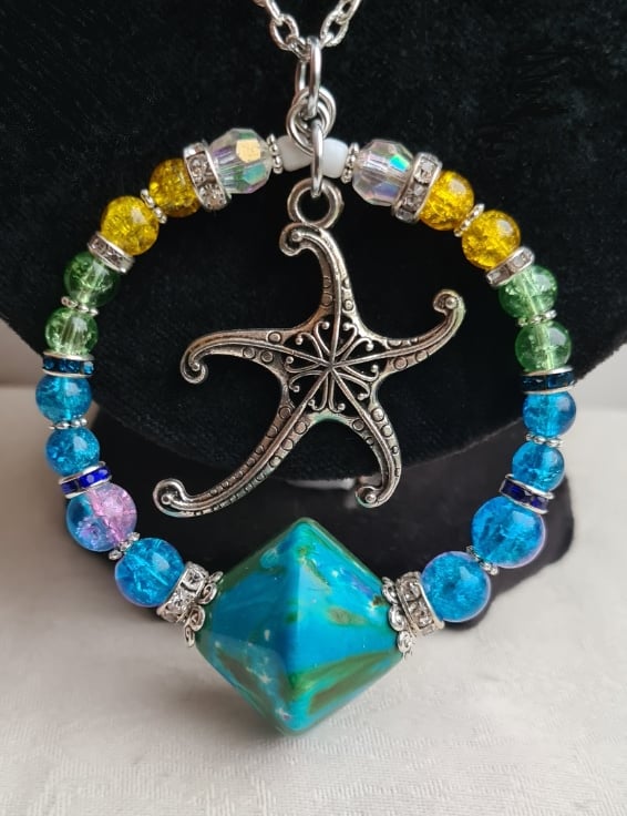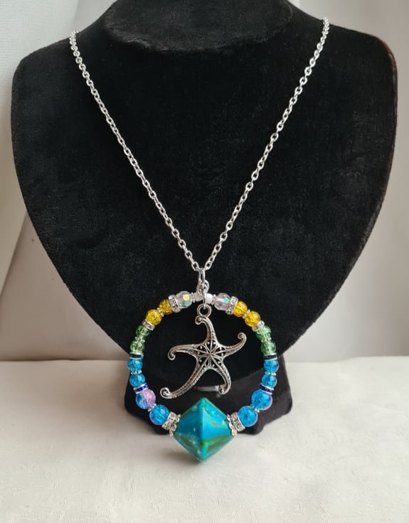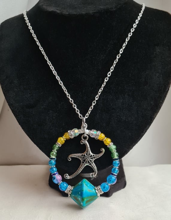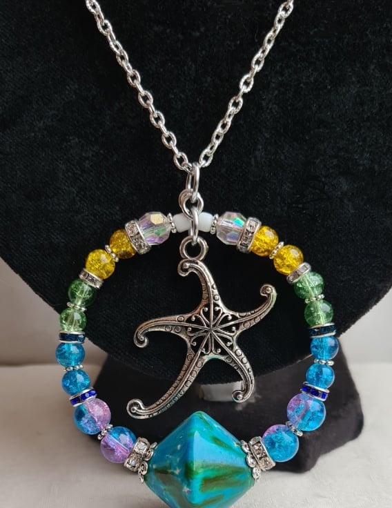 Pendant size is approx 8cm H x 6.5cm W. It is made of memory wire with crackle glass beads, faceted acrylic beads, a large Blue/Green bead and a Tibetan Silver Starfish charm.