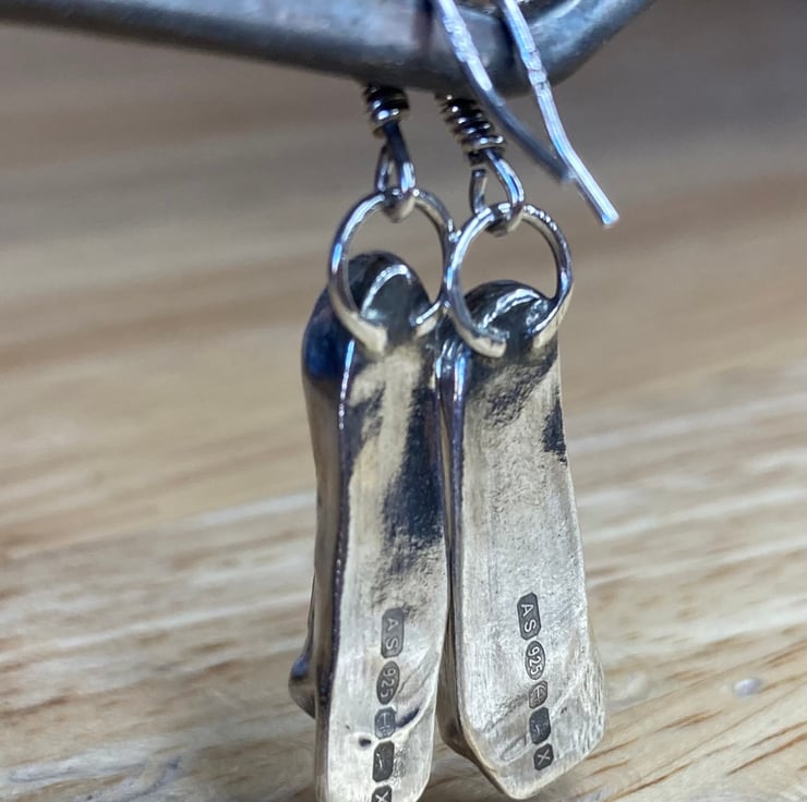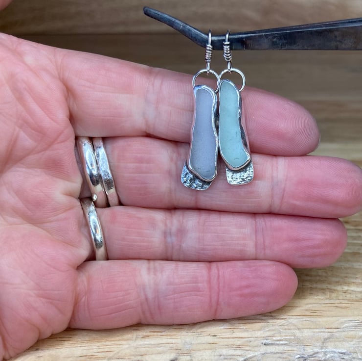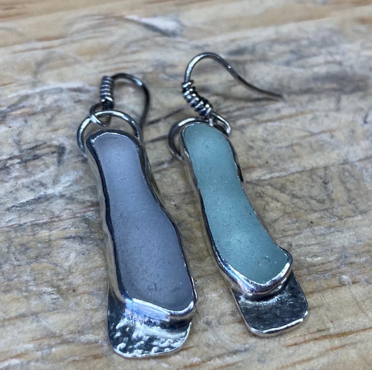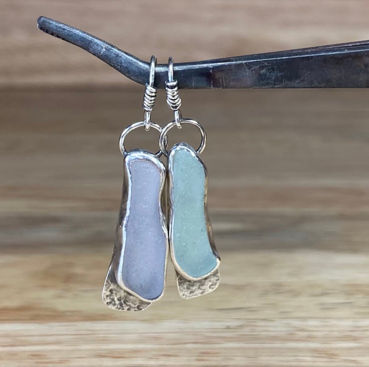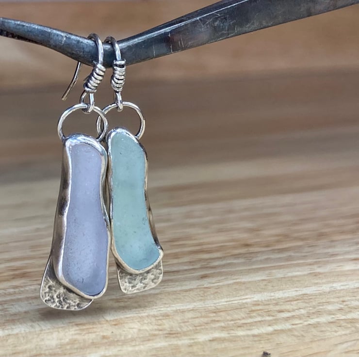 Entirely unique stunning pair of dangle earrings, handmade using sterling and fine silver with pale lavender and light blue welsh sea glass collected from a beach in North Wales, these are sisters not twins! Who wants matching earrings anyway?! Love these. Each earring has been officially hallmarked at the assay office for authenticity of the precious metals. Will come in a lovely white jewellery box which will be wrapped with twine and lavender.