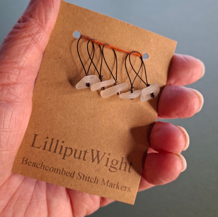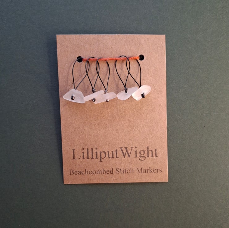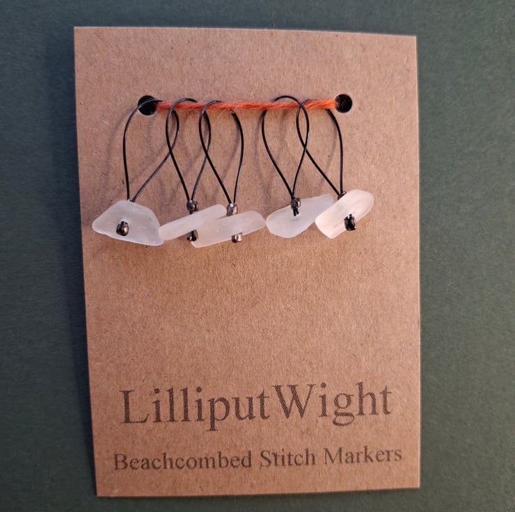 A set of five sea glass stitch markers in white. The sea glass is all genuine and has been collected from beaches close to my home on the Isle of Wight.