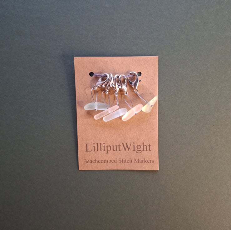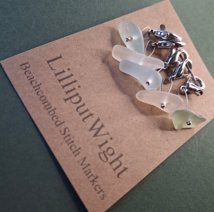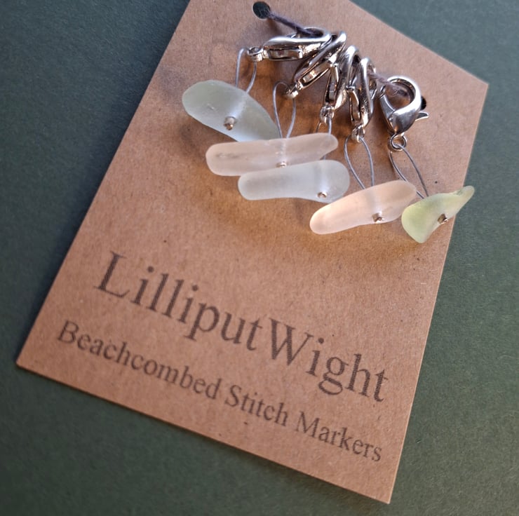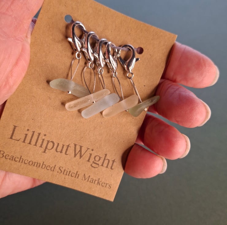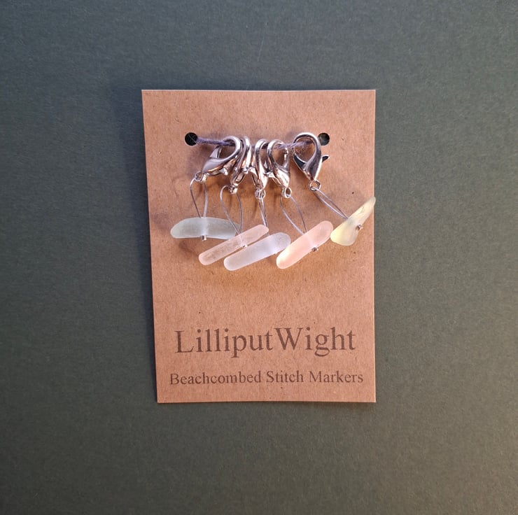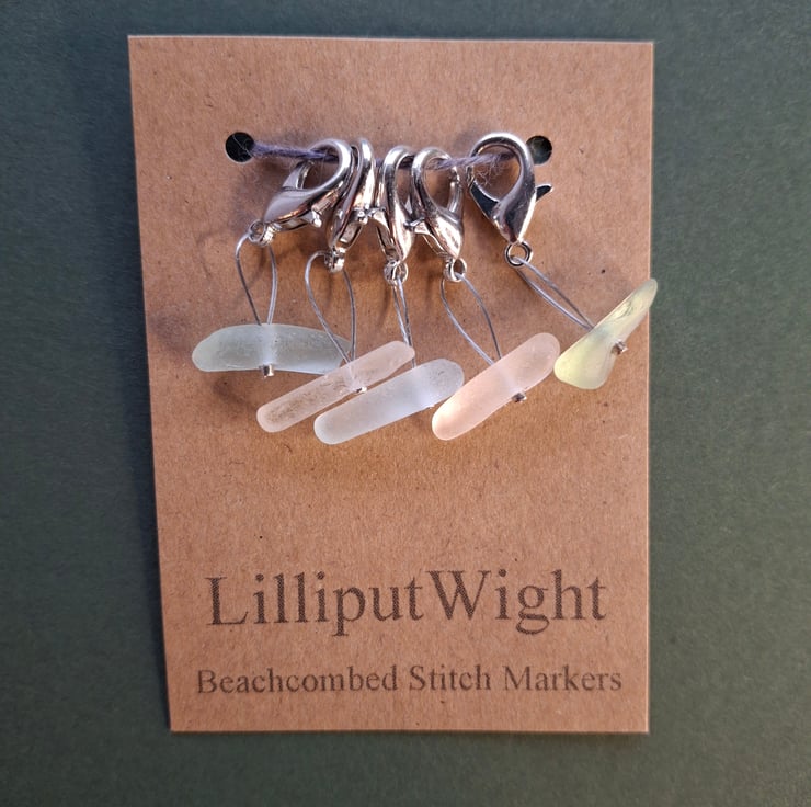 A set of five sea glass stitch markers with clips for crochet. The sea glass is all genuine and has been collected from beaches close to my home on the Isle of Wight.