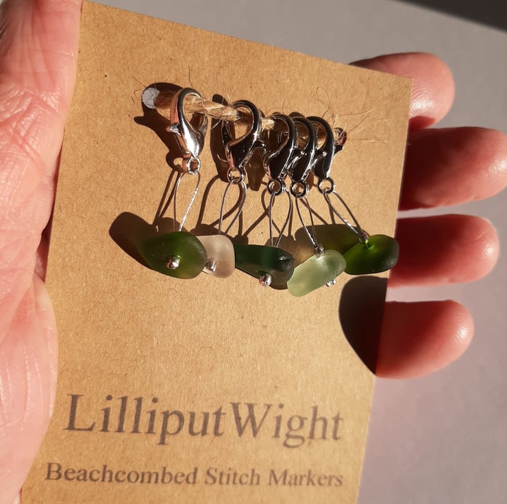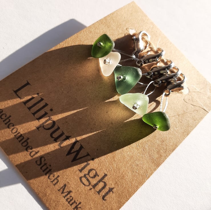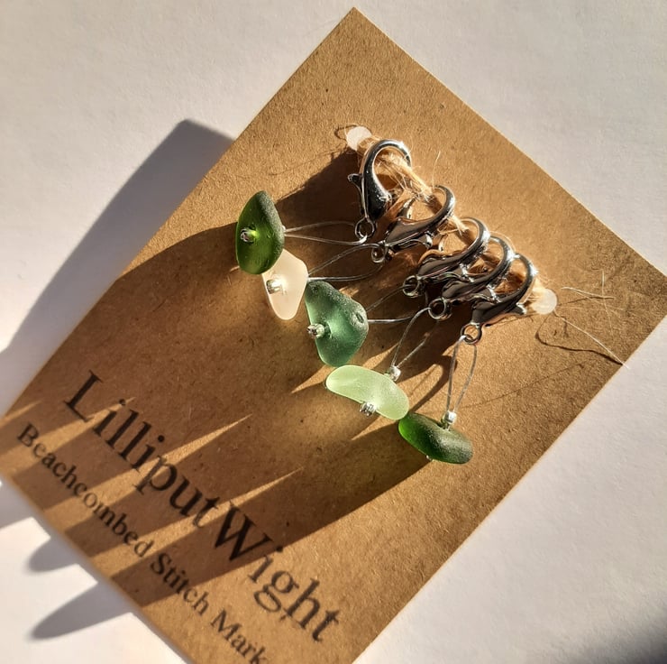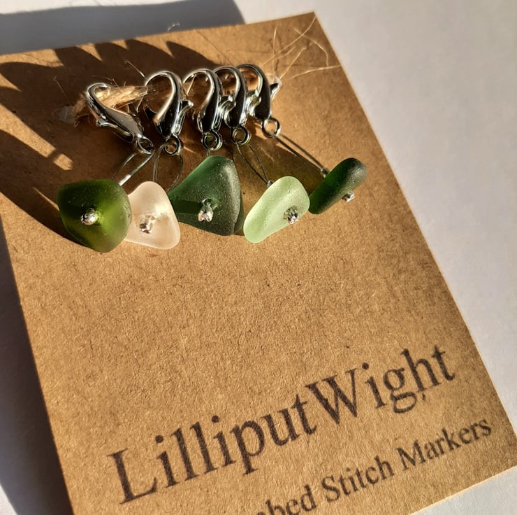 A set of five sea glass stitch markers in shades of green and white with clips for crochet. The sea glass is all genuine and has been collected from beaches close to my home on the Isle of Wight.