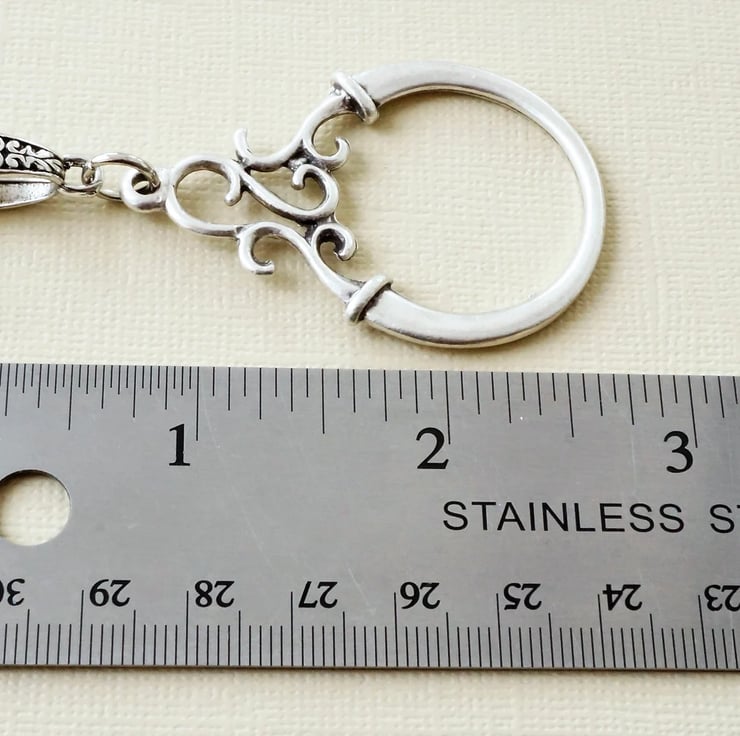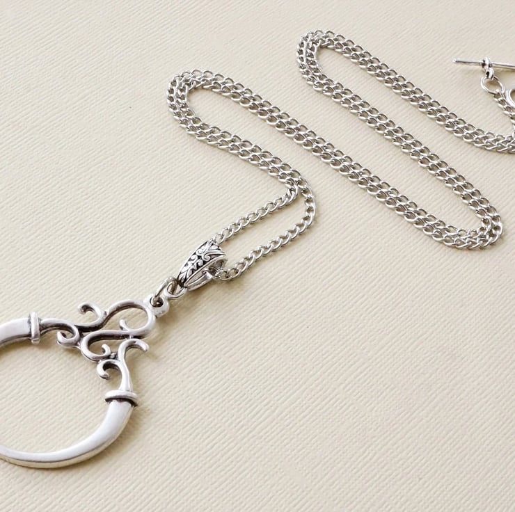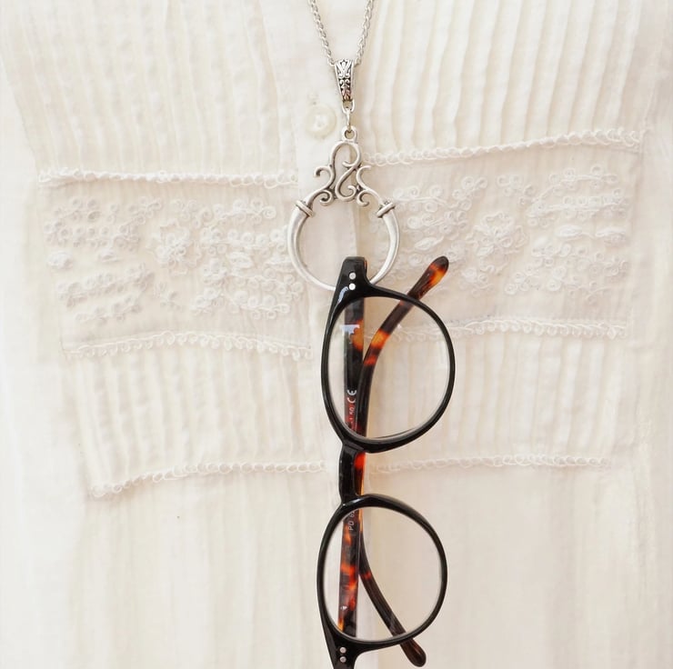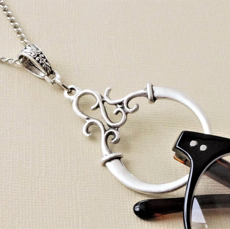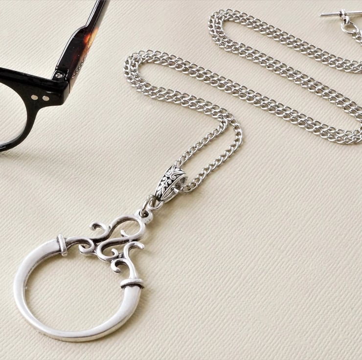 A modern glasses chain in an antique silver finish featuring an ornate scroll design ring in matte silver. Can also be worn as a minimalist pendant necklace.