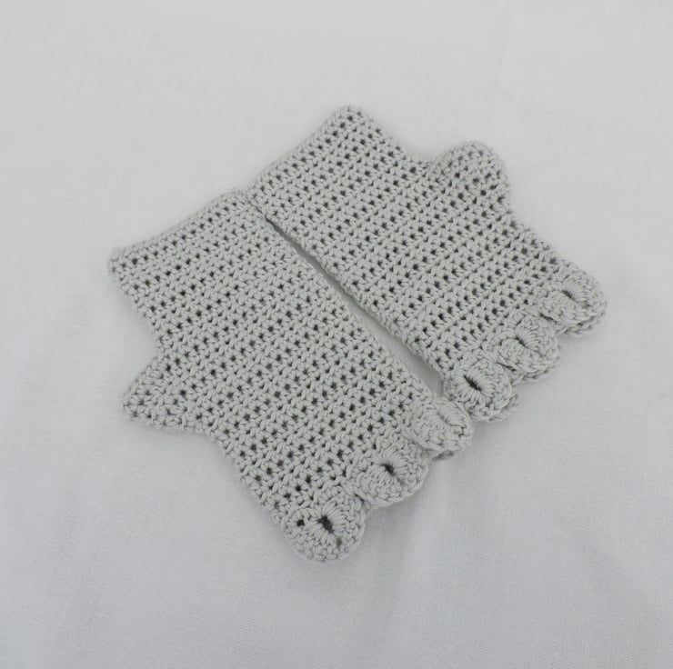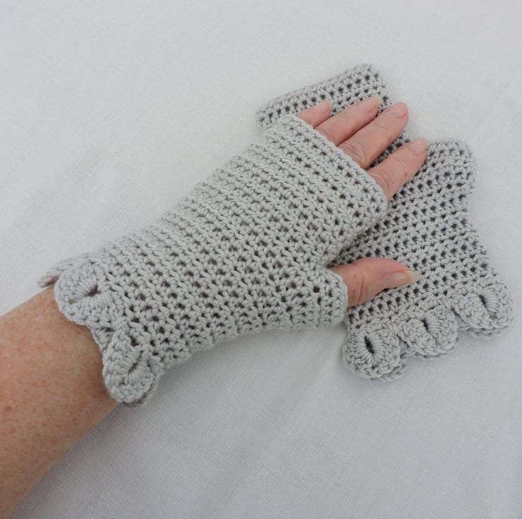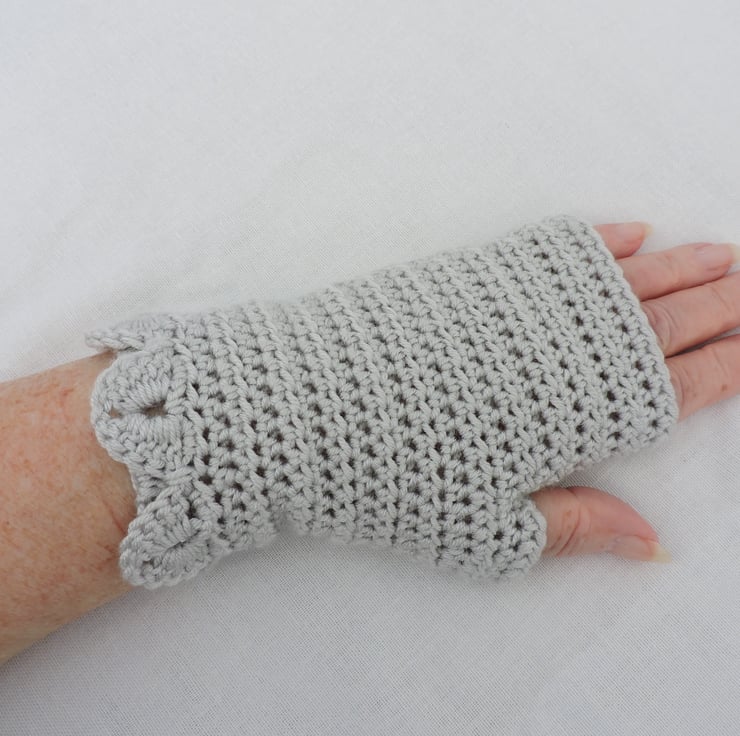 Sale now 5.00 A pair of crocheted fingerless mitts which have been made with a 100% premium acrylic pastel silvery grey yarn. A plain body with a single row of dragon scales at the cuffs. The perfect winter warmer for those that like to keep their fingers free.