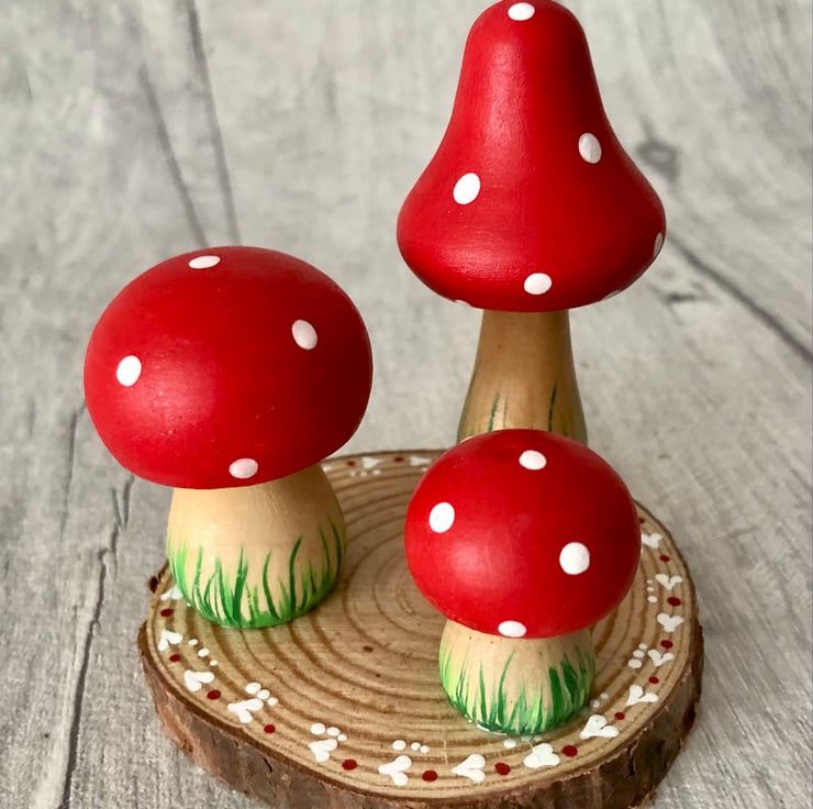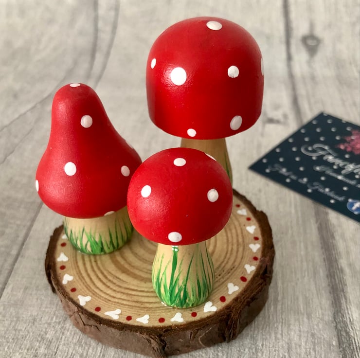 Set of three gorgeous little handpainted toadstools or mushrooms mounted on a dinky log slice. Perfect cute little decoration to tie in with a fairy or woodland theme although please note that these are not suitable for young children to play with, they are for decorative purposes only.