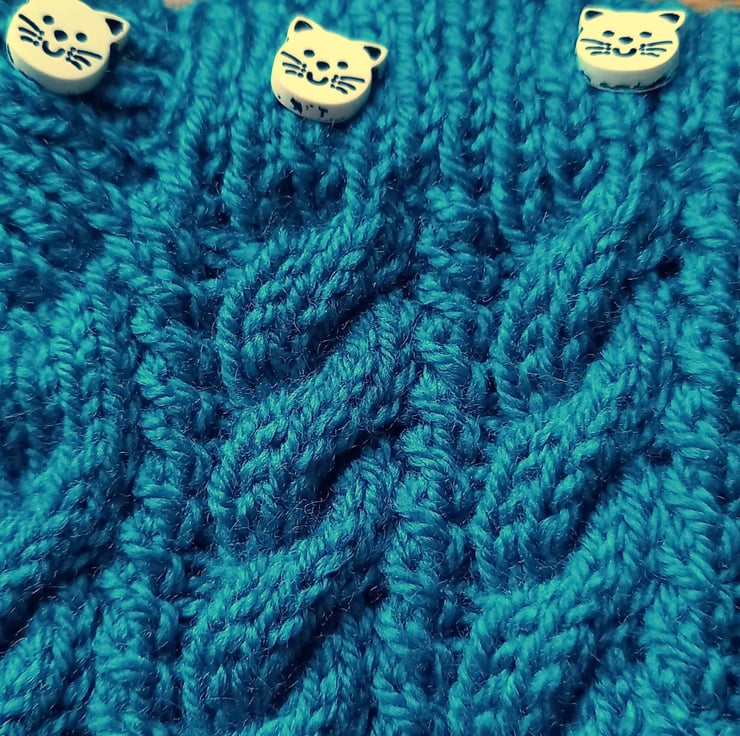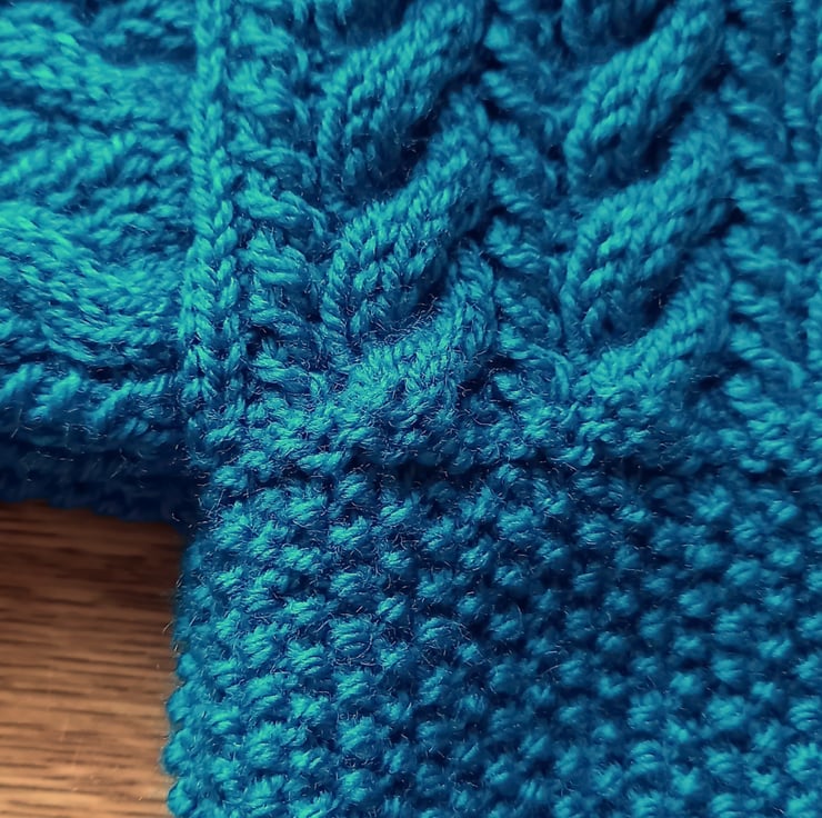 Knitted in a petrol blue colour in moss stitch on the lower half, with a cable stitch detail on the upper half.
