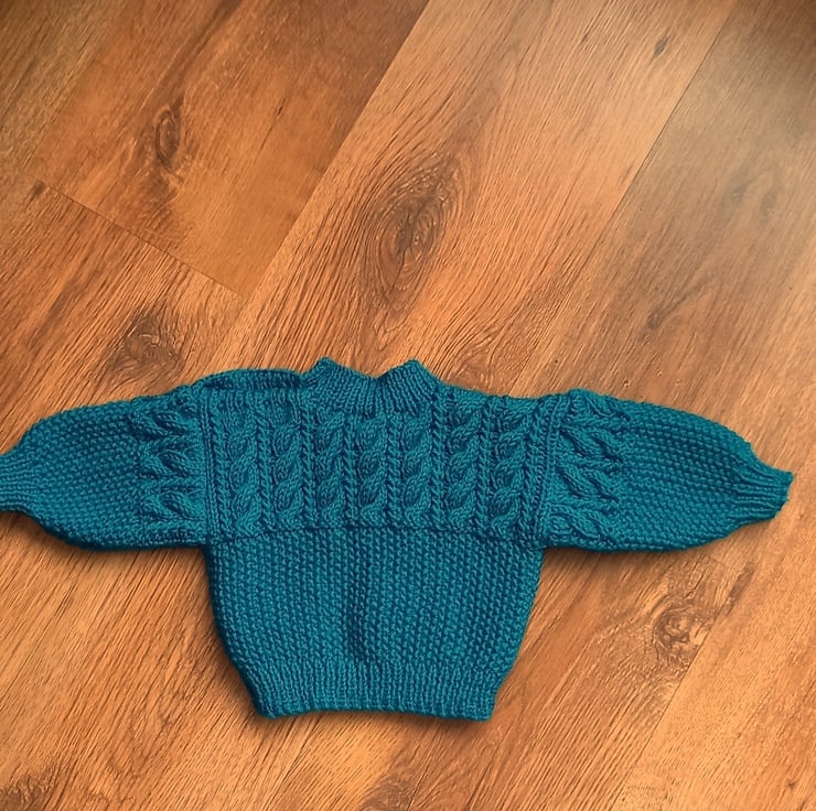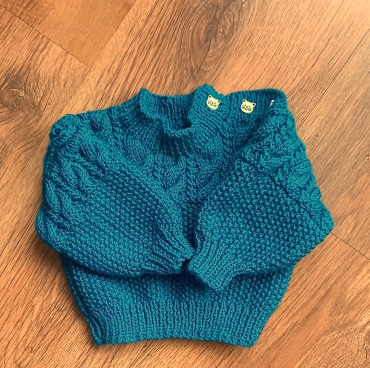 Hand Knitted baby boys jumper with shoulder fastening, of three white cat faced buttons, making fitting easy over baby's head.