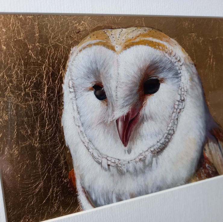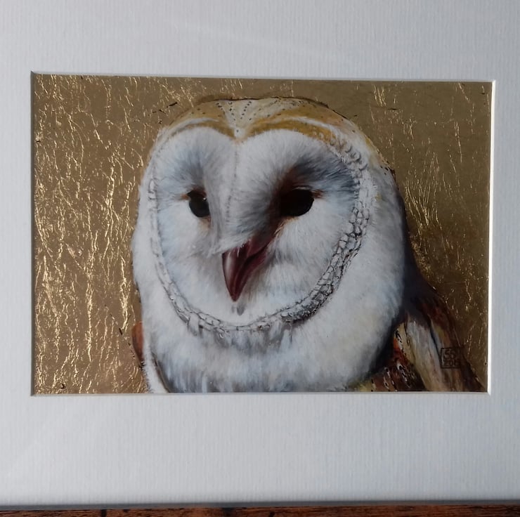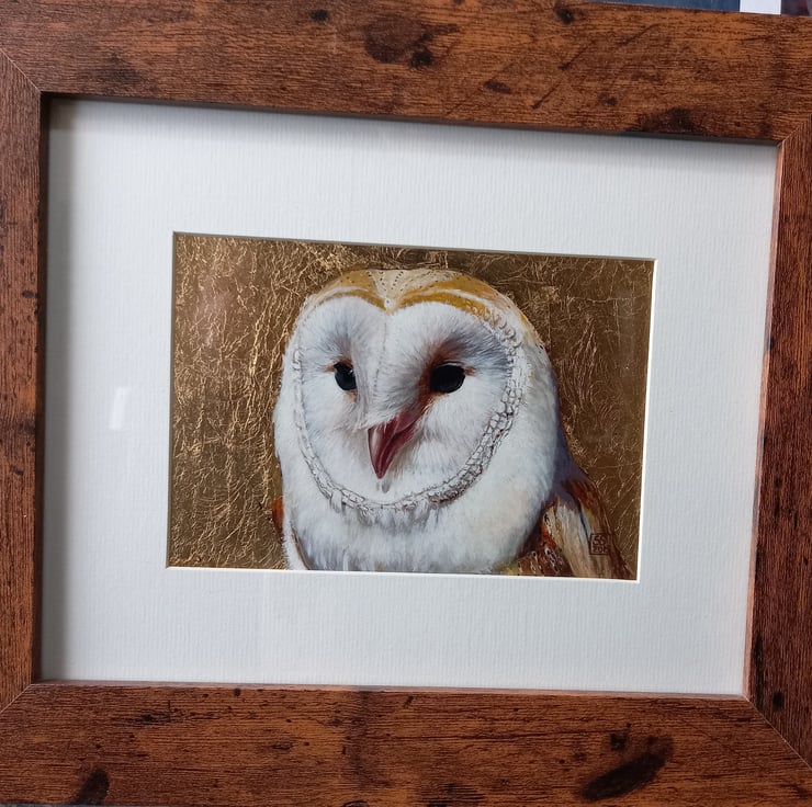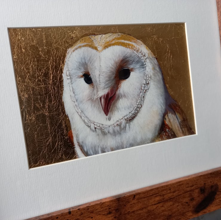 This sweet little barn owl painting measures appropriately 4.5 inches by 6.5 inches and was painted on canvas textured paper using oil paints and gold leaf. The painting is pictured framed, however please note it will be sent unframed but in the mount pictured. This measures 8 inches by 10 inches.