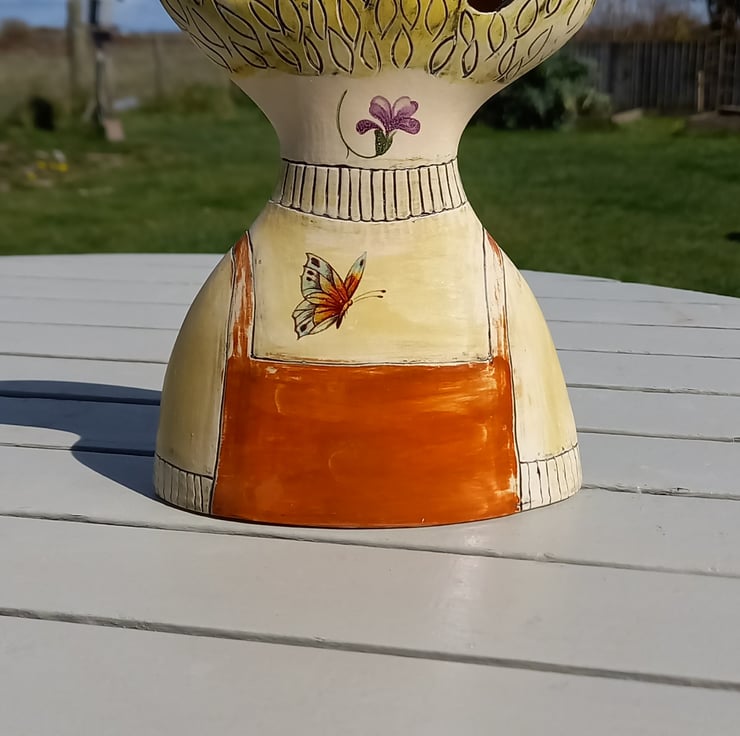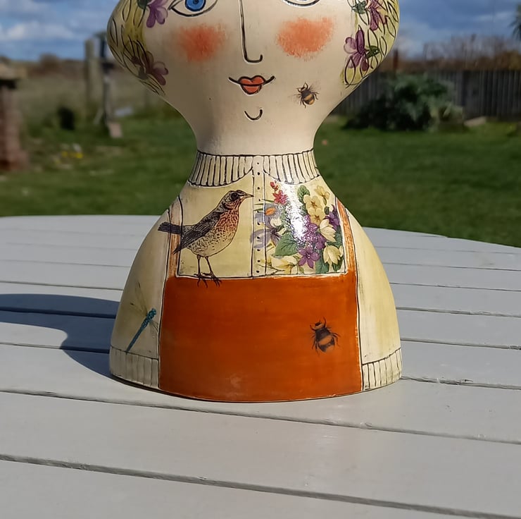 Handbuild in white clay this figurative vase measures 23cm approximately. Painted and decorated with coloured slips and glaze in a transparent glaze glaze.Ceramic decals of bird,bugs and flowers are fired on to add detail .Openings at the back of her head allow for dried flowers or grasses. Will be carefully packed and posted.